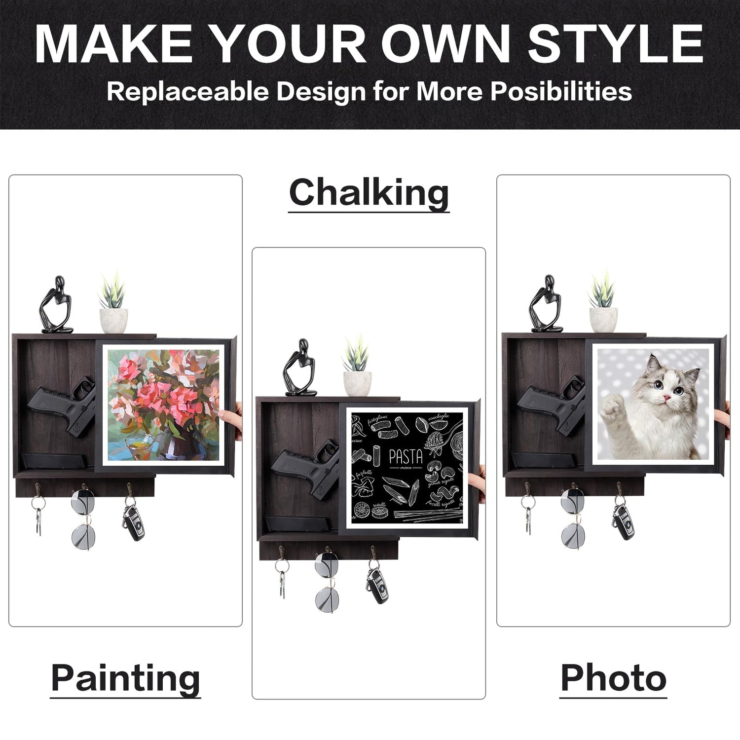 - 【PREMIUM HIDDEN GUN STORAGE】This hidden gun safe for pistols is an ideal concealment furniture for storing pistols, letters, cash, etc. valuables. With the replaceable design, the hidden wall gun safe box allows you to add a favorite photo or painting art works, or chalking painting for better camouflage.