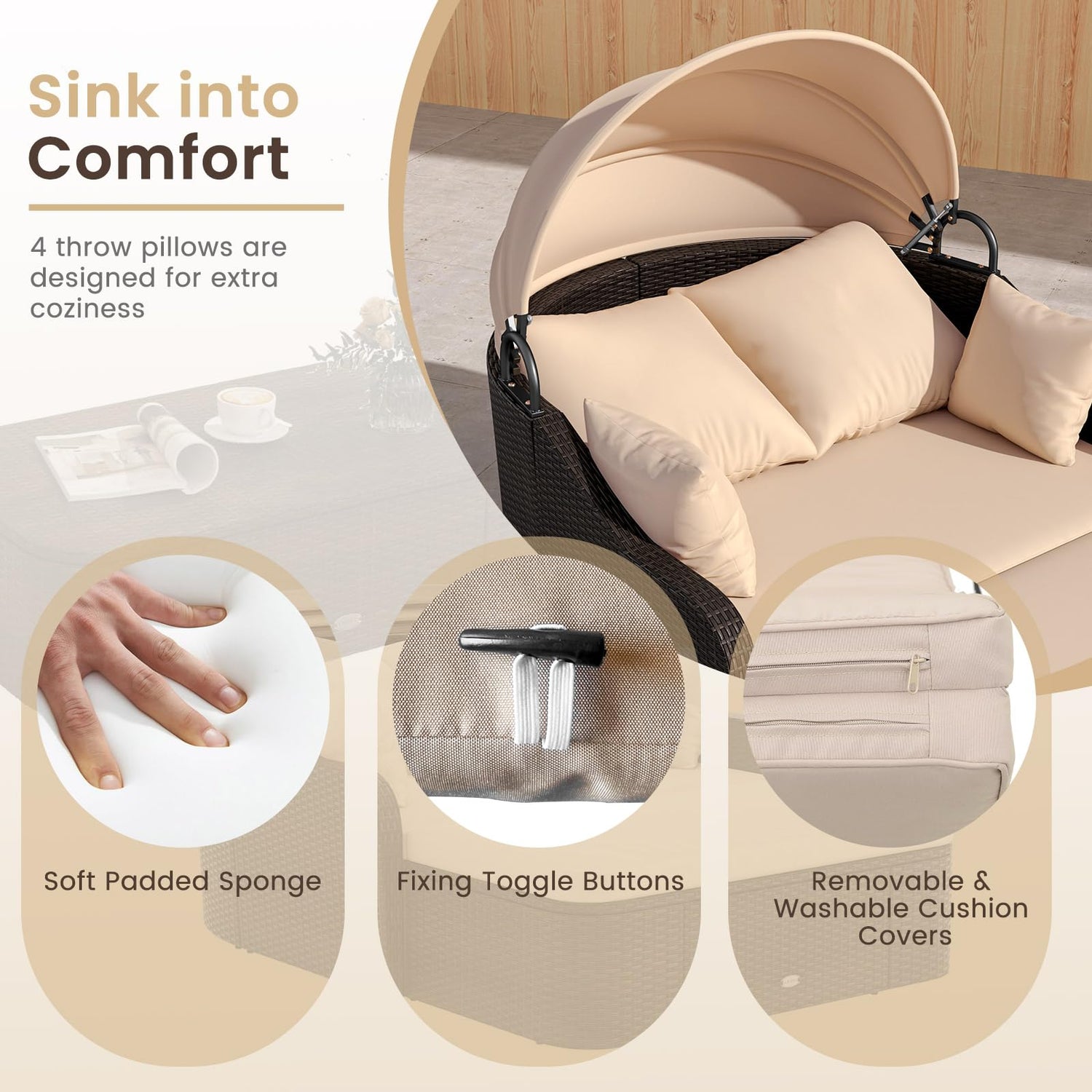 - [Personalized Shade Experience]: Enjoy personalized comfort with the convenient retractable canopy of this outdoor daybed, allowing you to adjust the shade to your desired level. The overall dimensions are 75.5” x 52” x 50” (L x W x H).
