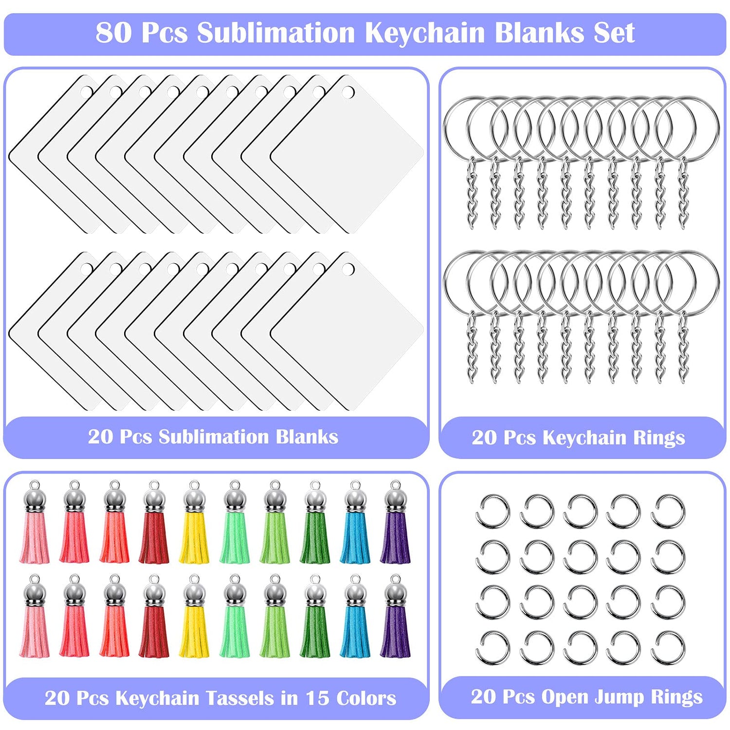 - 【Package Include】Modacraft 80 Pcs sublimation keychain blanks set comes with 20pcs square sublimation blanks, 20pcs Keychain Tassels in 10 Colors, 20pcs keychain rings, and 20pcs jump rings. Suitable for sublimation keychain projects and crafts.
