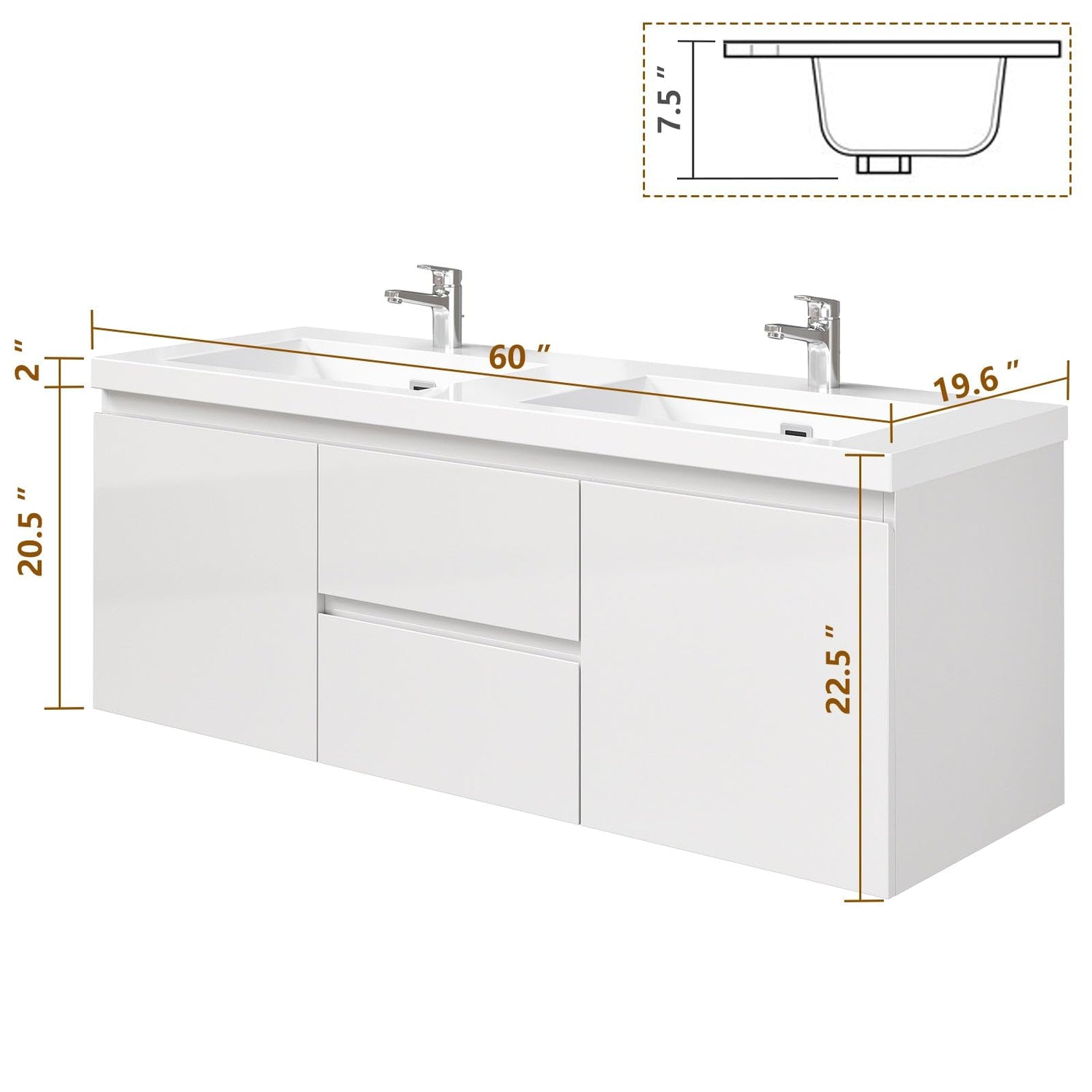 MODCART 60inch Bathroom Vanity with Double Sink Combo Set, Wall Mounted Floating Storage Vanities Cabinet of 2 Soft-Close Drawers and Doors