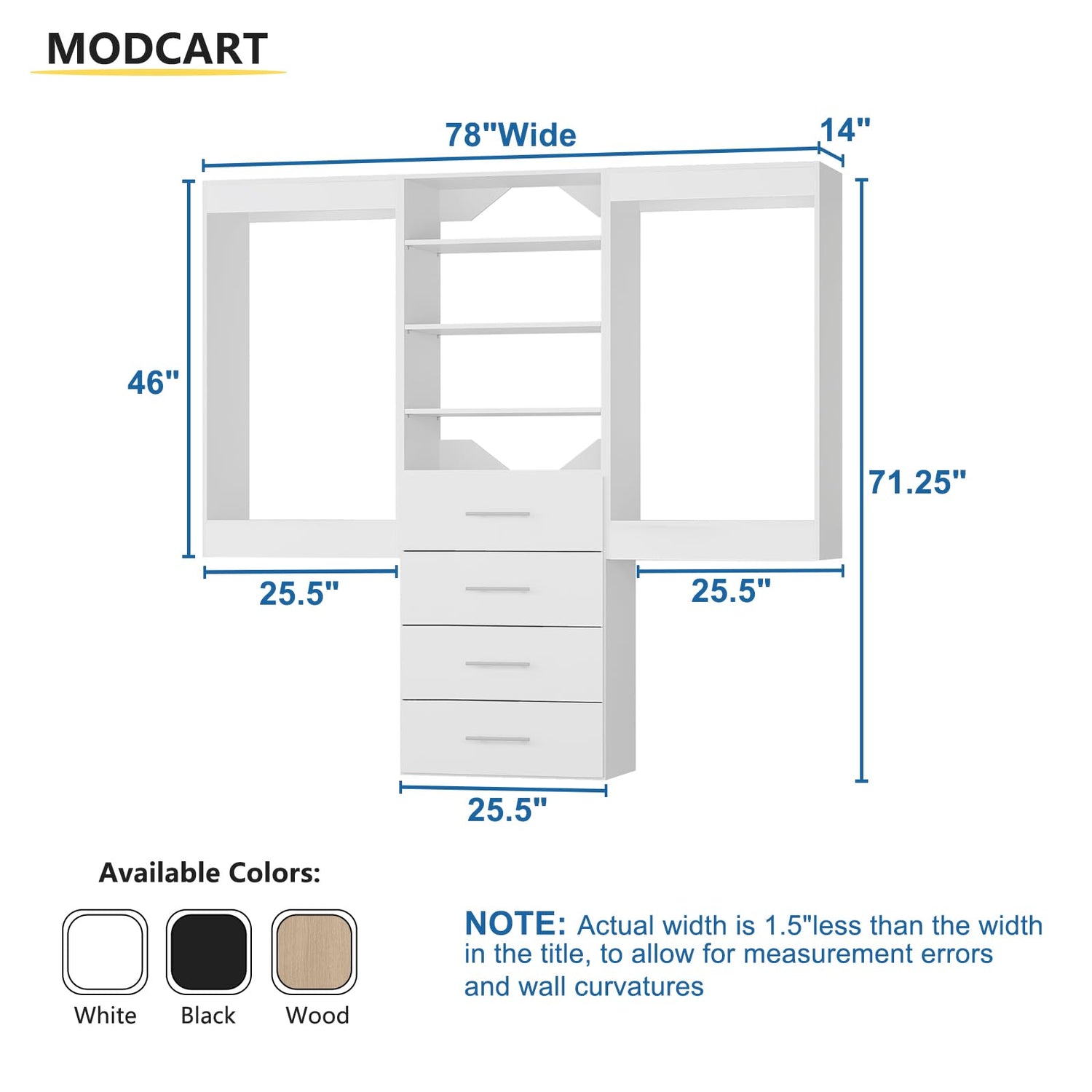 MODCART Modular Closet System, 78" Wide Closet Organizer System with Hanging and Drawers, Wood Tower Closet Storage for Walk In Closets, Wall Mounted Wardrobe Organizer Kit System, Bedroom, White