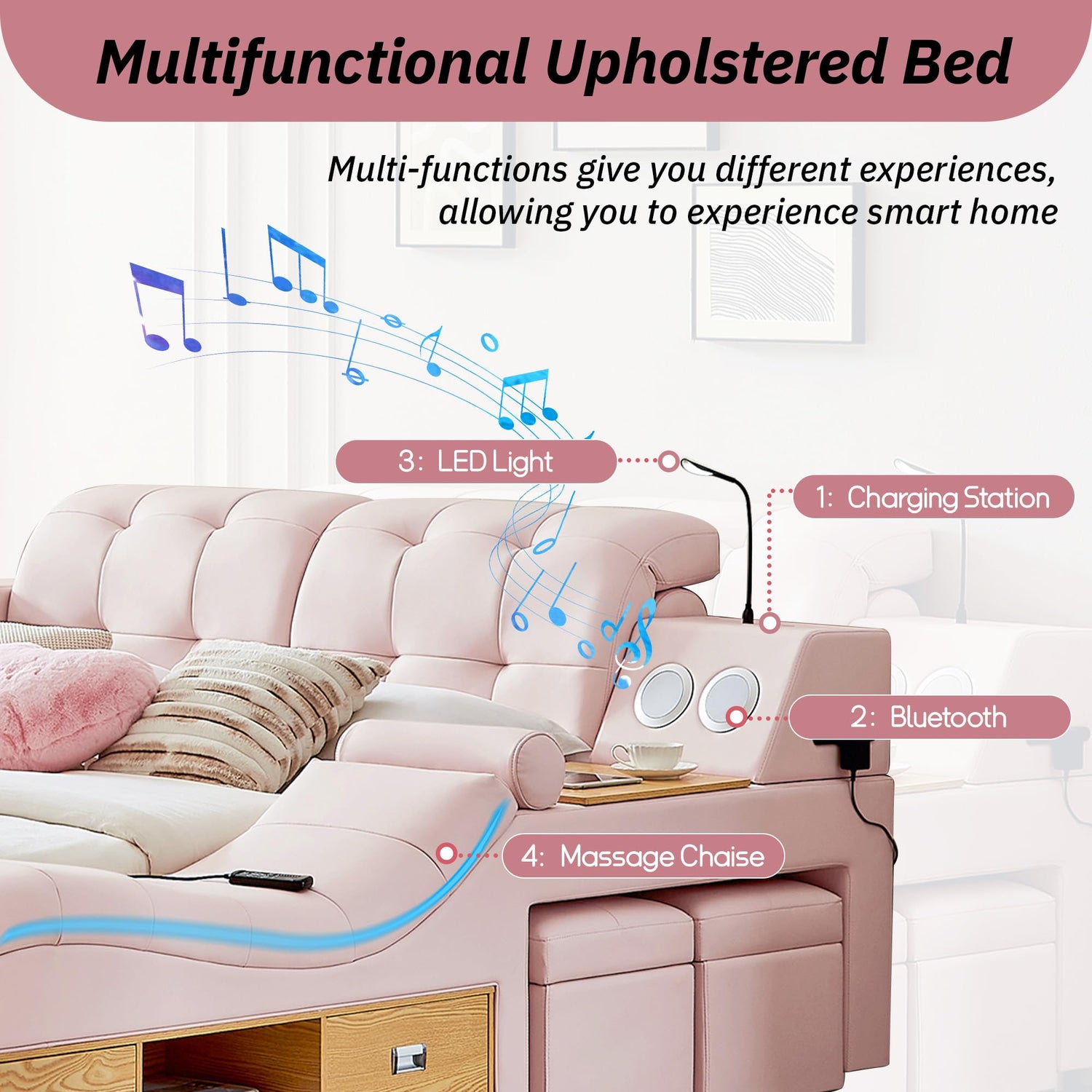 - 【Luxury Multifunctional Bed】Our new generation of multifunctional bed integrates massage, entertainment, storage and lighting, allowing you to enjoy a comfortable smart home life and enjoy the ultimate experience before falling asleep every night! which will make your bedroom your favorite place.