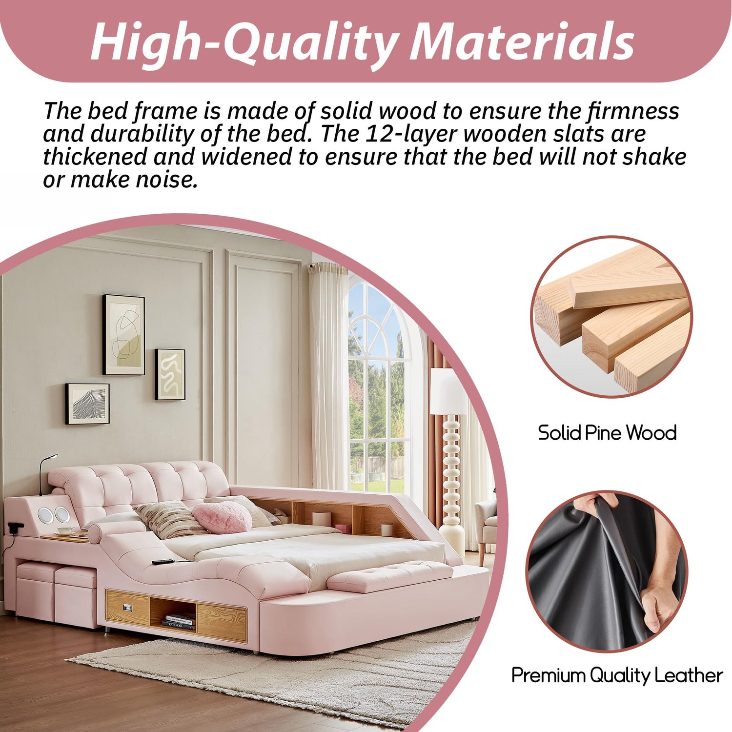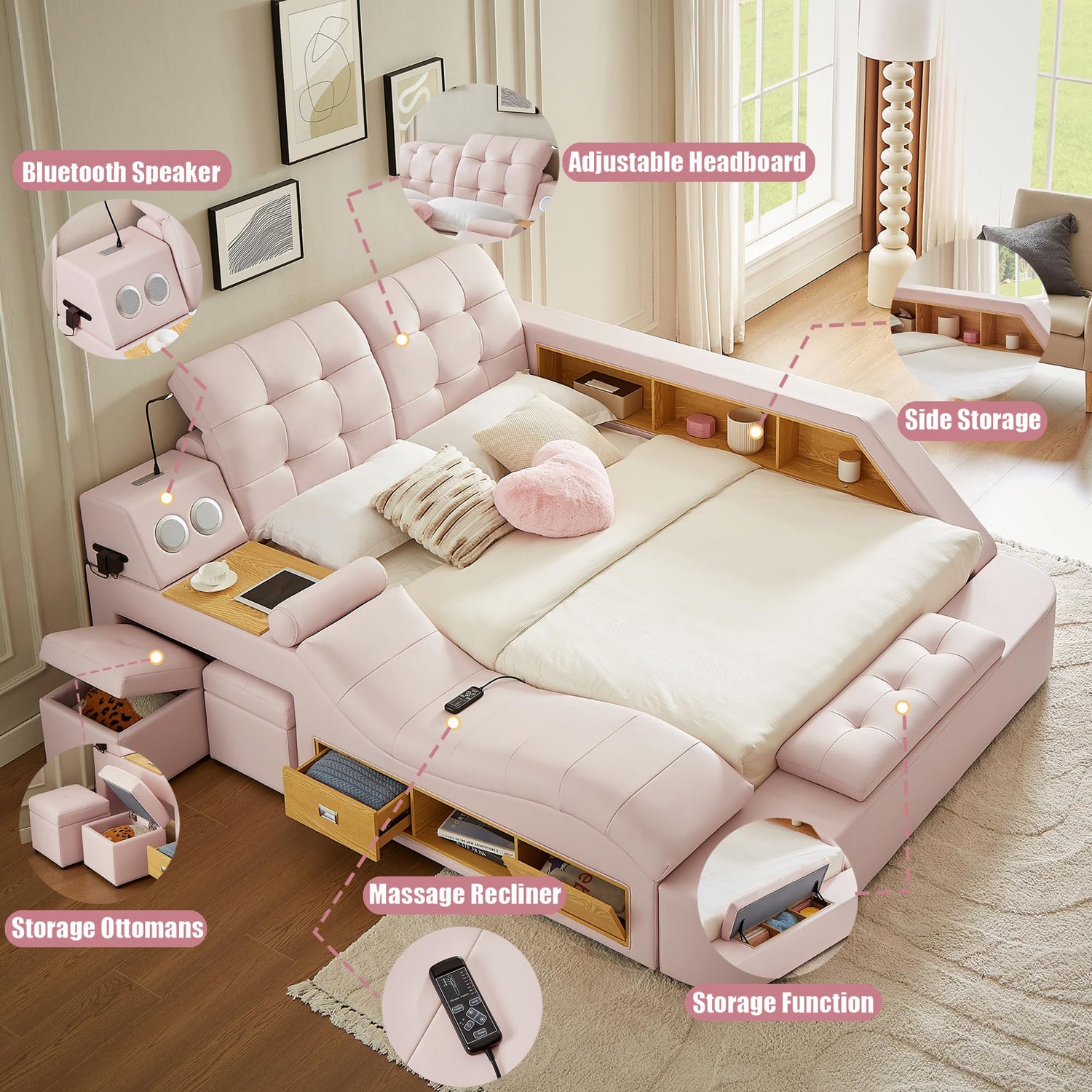 Modehodei Luxury King Size Bed Frame, Modern Multifunctional Bed with Massage Recliner | Bluetooth Speaker | USB Charging Station | Adjustable Headboard, PU Leather Fabric, Bedroom Furniture, Pink