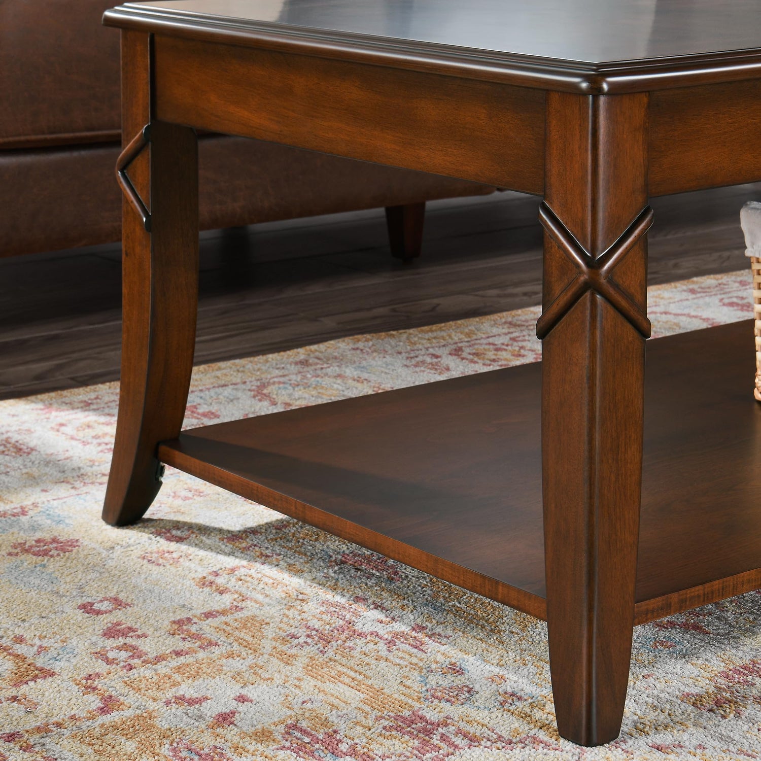 Wood rustic brown surface with carved leg make the coffee table full of personality.and the large desktop with storage shelf offer plenty of space for everything you need in your living room