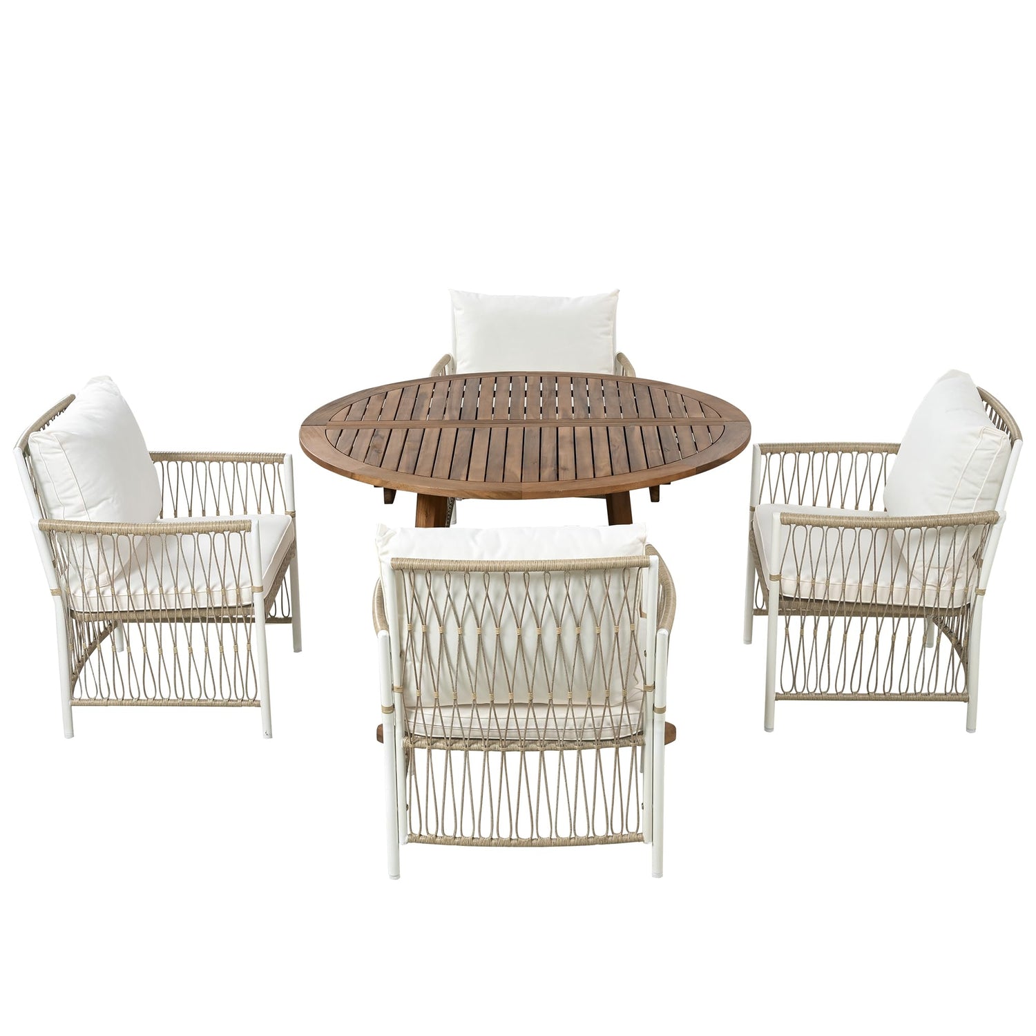 Modern 5-Piece Outdoor Patio Dining Set, All-Weather Acacia Wood Extendable Round Dining Table with 12inch Butterfly Leaf and 4 Rattan Arm Chairs for Backyard, Garden, Poolside