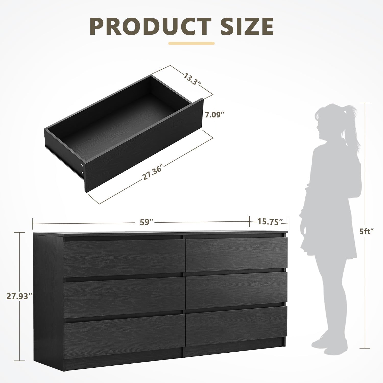 Modern 59'' Black Dresser for Bedroom, 6 Drawer Dresser with Minimalist Design, Thickened Panel & Smooth Metal Slides, Wood Long Chest of Drawers, Large Storage Wooden Dressers for Bedroom