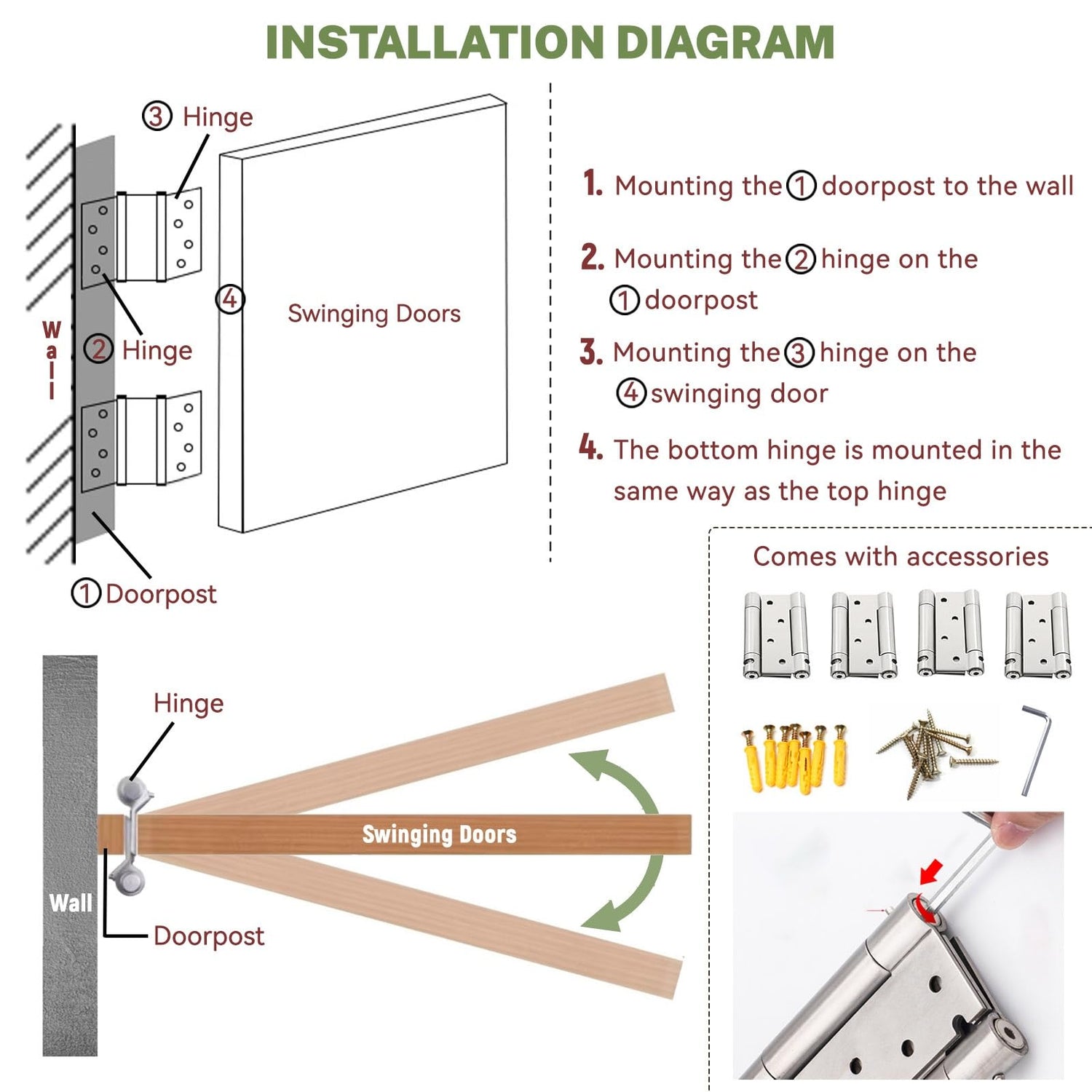• Bi-directional Hinges:The cafe swinging doors are equipped with 4 high-quality stainless steel bi-directional hinges, which support the door to swing flexibly in both directions for smoother opening and closing. The hinge gears can adjust the swinging speed, providing better operating experience and flexibility, convenient to adapt to different space requirements.