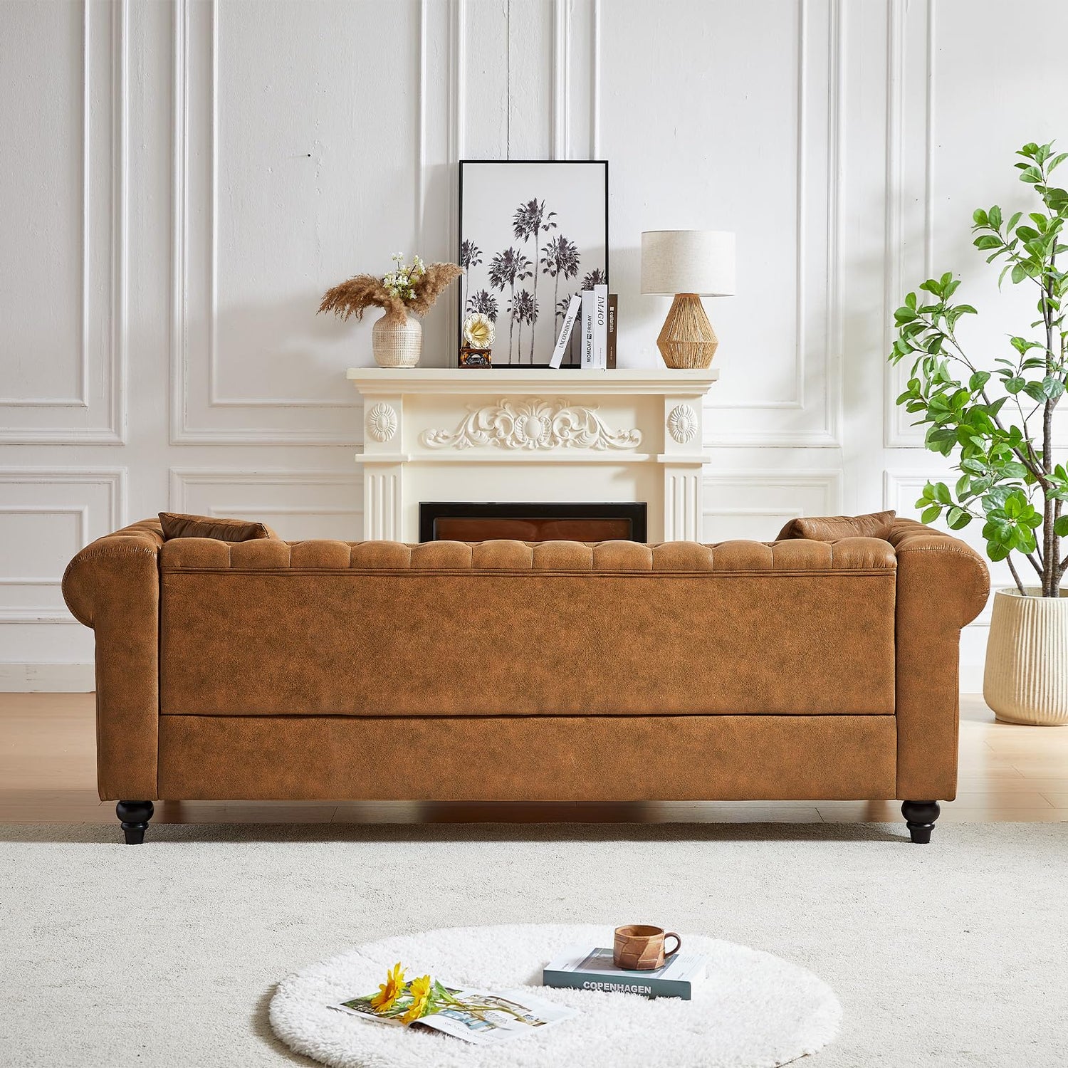 Modern Chesterfield Sofa Couch, 85.5-inch Tech Fabric 3-Seater Sofa with Rolled Arms and Tufted Button for Living Room, Office, Brown