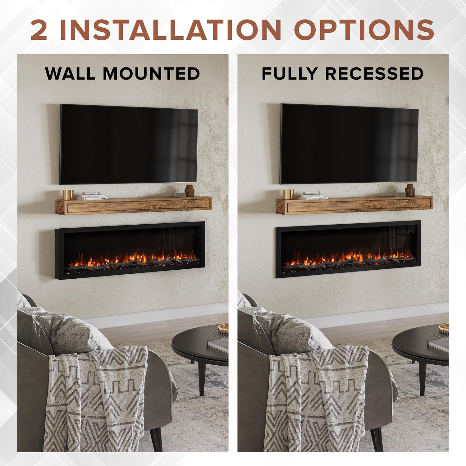 - 🔥 TWO WAYS TO INSTALL: The Highmark 72 Inch Linear Electric Fireplace mounts directly on a wall or can be recessed into a wall or frame for a seamless look.