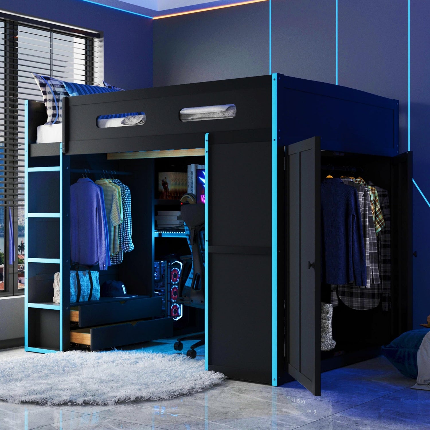 Modern Full Size Wood Gaming Loft Bed with Desk and Wardrobe,USB Port and RGB LED Light,for Kids Teens Adults Bedroom Use (Cloud Blue#RGB, Full)