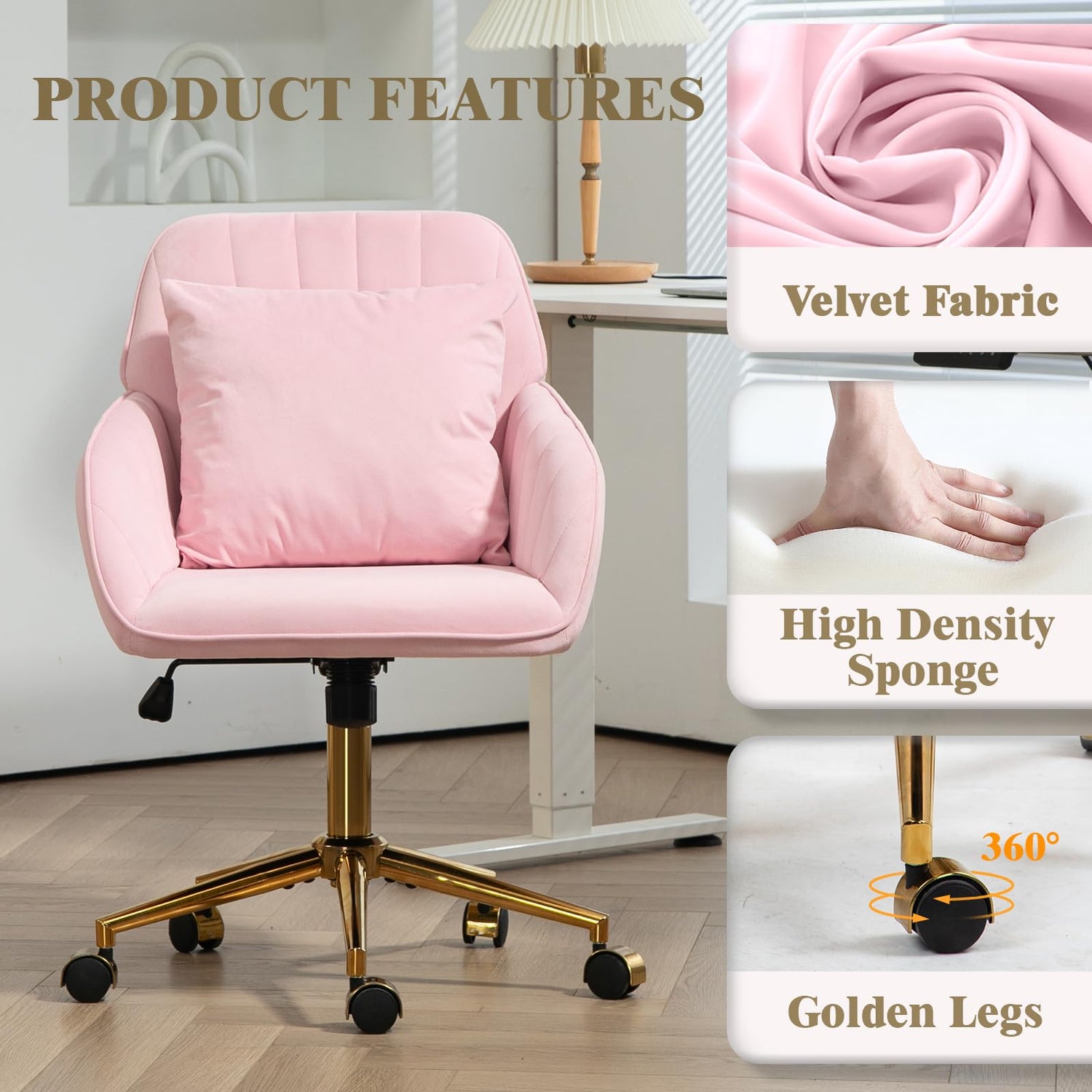 Modern Office Desk Chair with Back & Wheels for Makeup Room, Vanity Chair with Gold Legs & Pillow in Velvet, Home Computer Chairs for Indoor, 360°Swivel Office Chairs Adjustable Height (Pink)