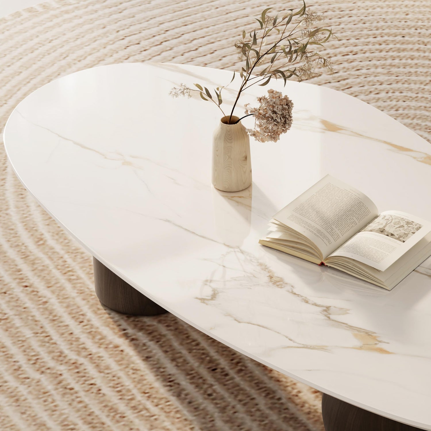 - MODERN STYLE: The triangle coffee table features an oval-shaped sintered stone top and three unique design legs. It is not only visually appealing but also highly practical. Its modern aesthetics complements the ambiance of various decorative styles