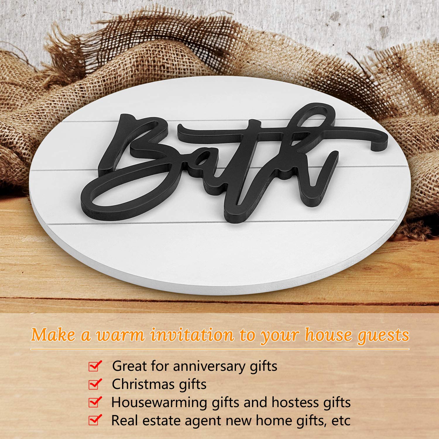 - (Suitable size):This cute wooden black and whote bathroom decor sign is 11.6 inches in diameter and is about 0.3 inches thick. You can hang it on the door or the wall, or put it on shelves and tables.The appropriate size makes the farmhouse decor fit in various places.