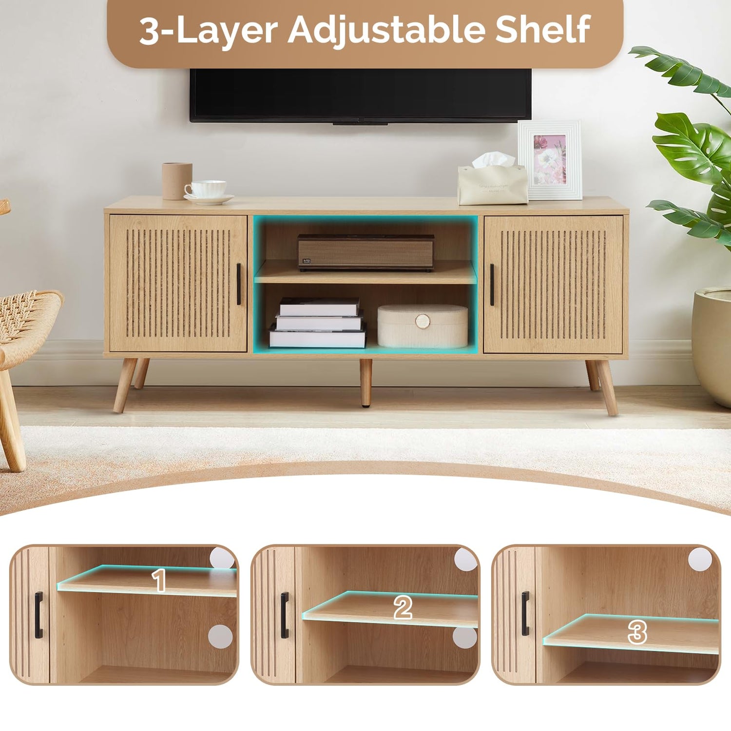 - 【Stunning Stylish TV Companion】Groove stripe doors match the natural surface, this TV stand with storage blends modern and natural style. Elevate your living space with our stylish tv stand, the perfect companion for your stunning 65-inch television. Say goodbye to dull surroundings and hello to a chic entertainment hub!