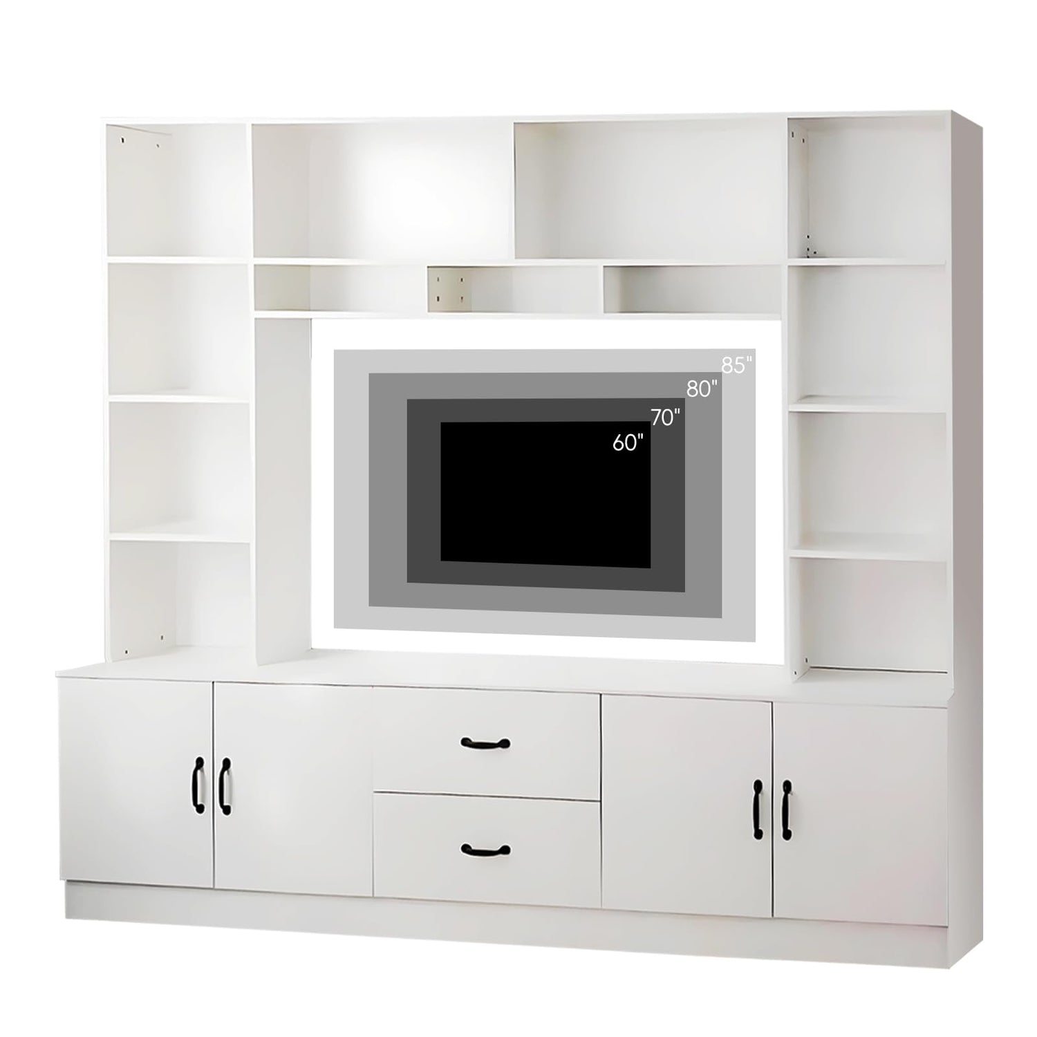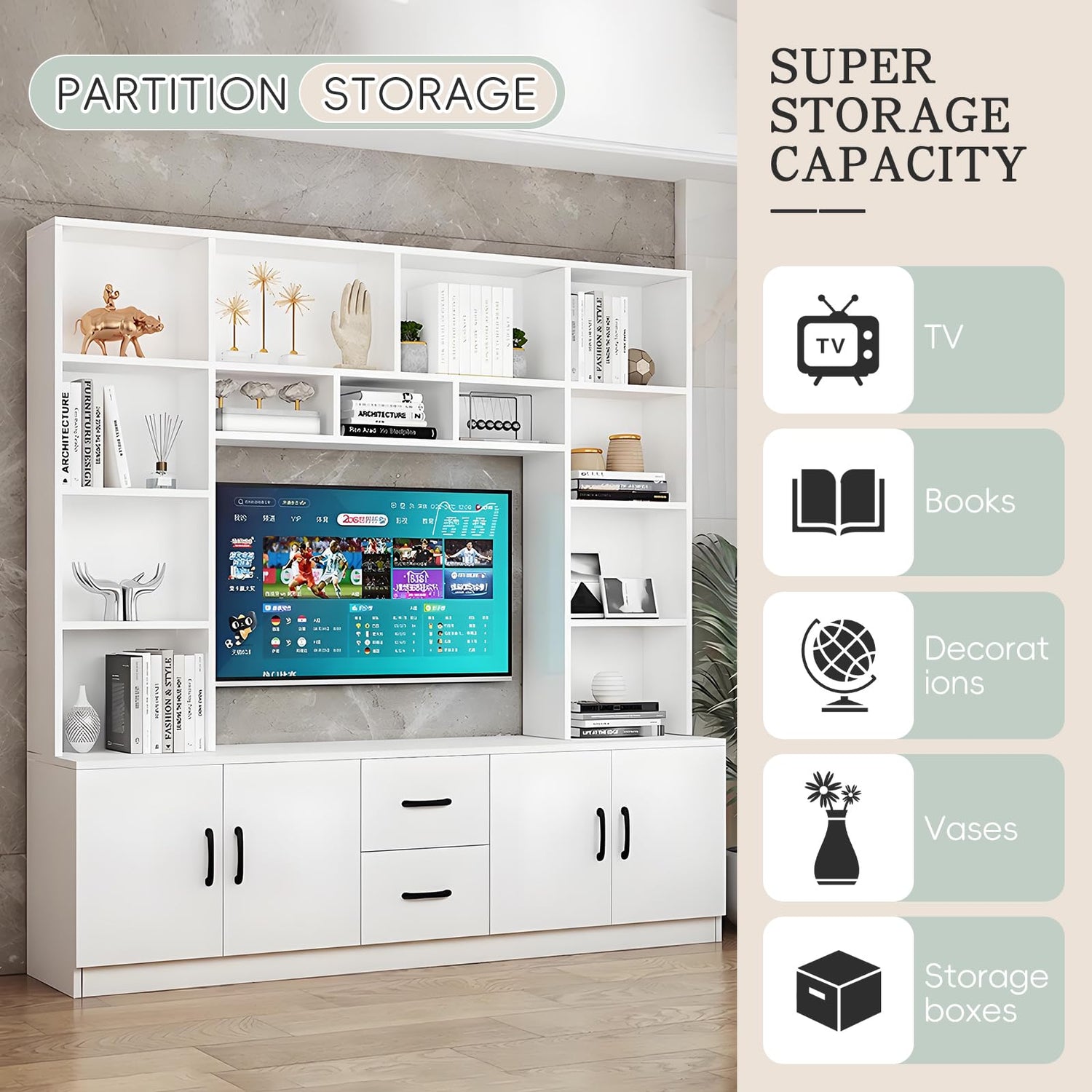 Modern TV Stand with Bookshelves, Entertainment Center with Cabinets & Storage Drawers, Fits up to 85-Inch TVs, Multifunctional Wall Unit for Living Room & Home Theater White 98.4"