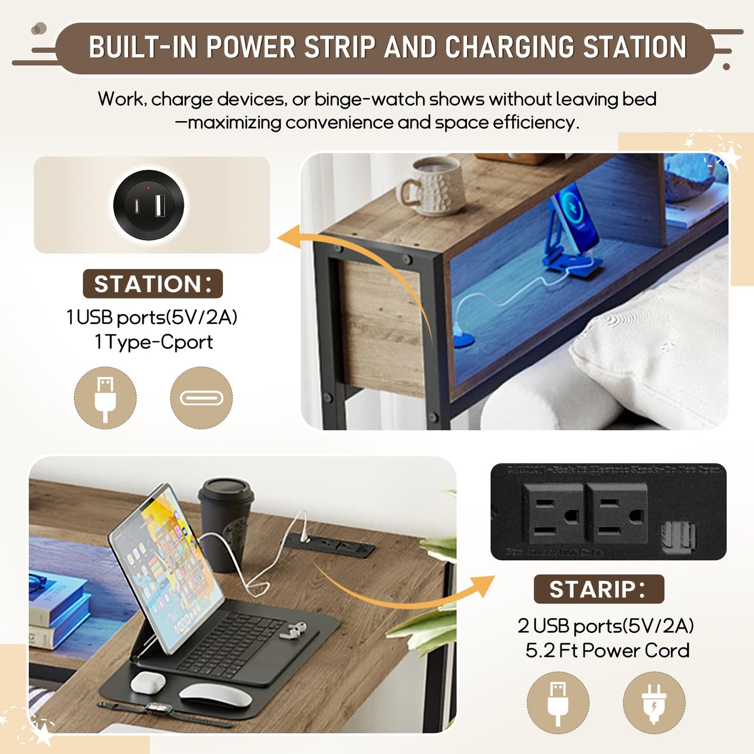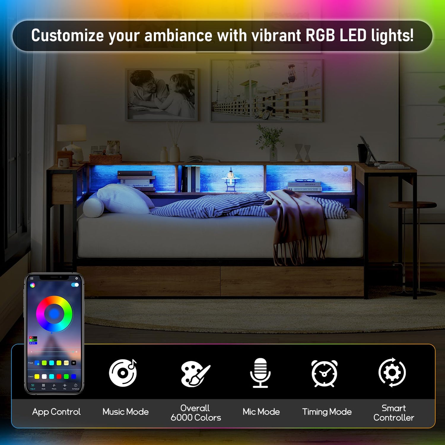 Intelligent Space Utilization Dual-Purpose Workstation: Features an extended desktop surface, creating the ultimate study-bed combo for students or WFH professionals Enhanced Storage System: Includes 2-tier shelving units and oversized underbed drawers for maximum organization 360° Charging Hub: Upgraded power station with 3 USB ports + 2 AC outlets positioned for optimal accessibility Dynamic RGB Lighting: Features voice-controlled LED strips with pre-set study/sleep/nightlight modes