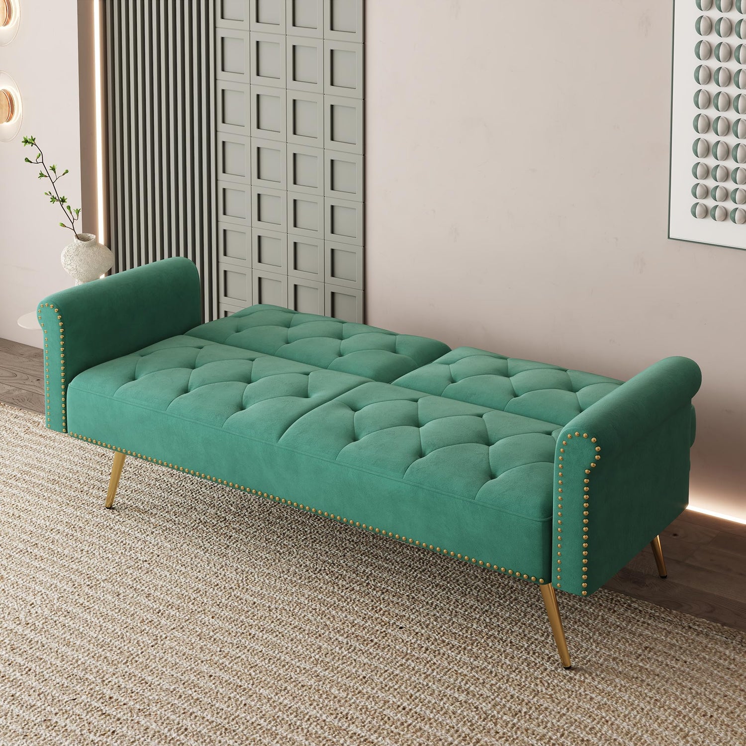 Modern Velvet 2 in 1 Futon Sofa Bed,Convertible Folding Sleeper Bed Couches with 2 Pillows,73" Tufted Recliner Love Seat with Golden Chrome Legs for Living Room Apartment Office (Green)