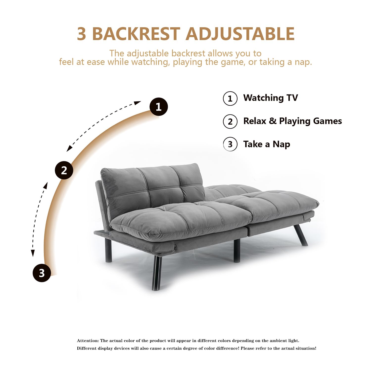 Modern Velvet Convertible Folding Futon Couch Sofa Bed Adjustable Pillow Top Arm Memory Foam Couch Double Loveseat Sofa for Compact Living Space,Dorm,Game Studio,Apartment,Bedroom (Light Grey)