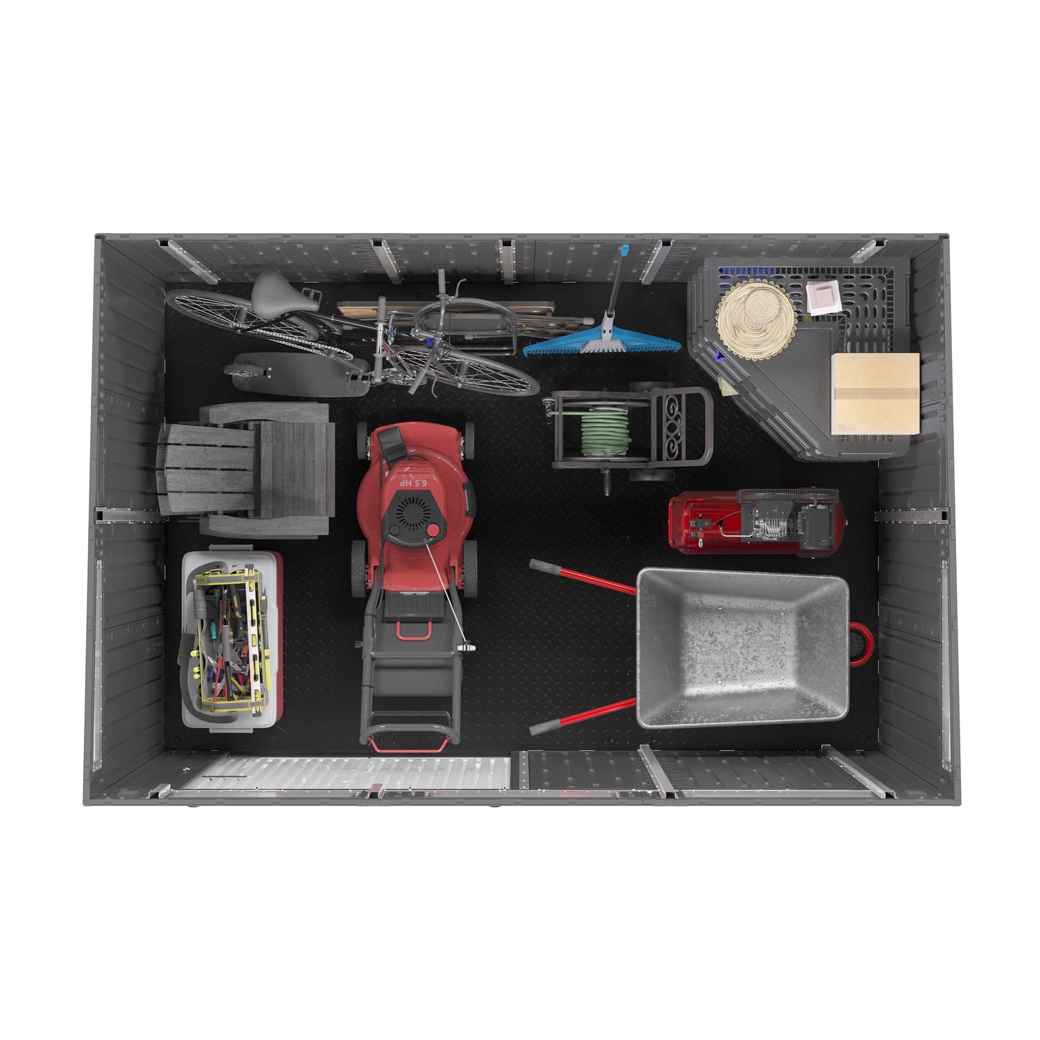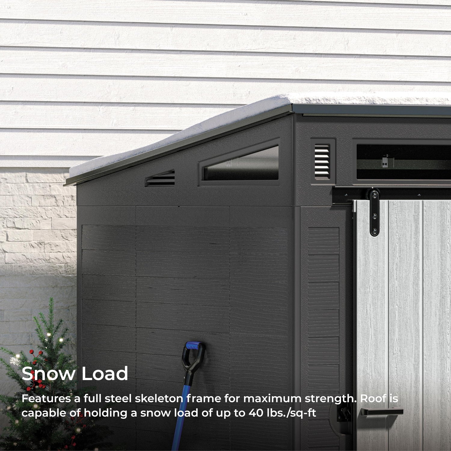 Details: The 10 ft. x 7 ft. Suncast® shed with a unique modern barn door feature is ideal for both its functionality and trend-forward design. With 483 cu. ft. of space, this shed features a sturdy sliding door that allows you to access your items easily and is pad-lockable for added security (lock not included). The reinforced resin floor is built to withstand heavy loads and the metal-reinforced, multi-wall resin panel construction provides additional strength and stability. The large transom windows allow for natural light making it easy to find what you need. This shed is beautiful, strong, and built to withstand the elements all year long.