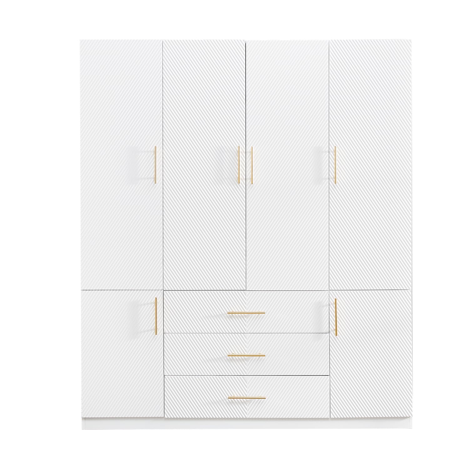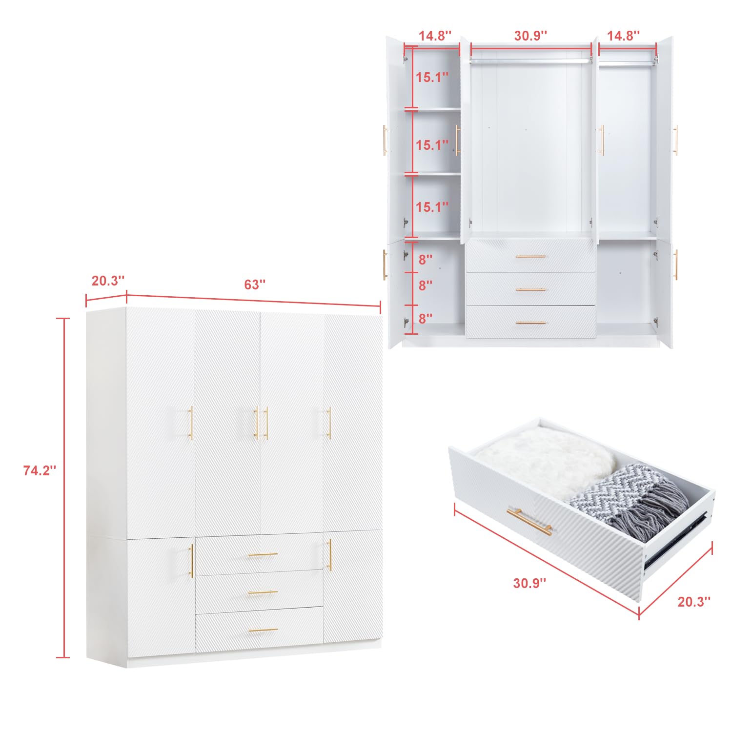 ModMakers 74.2"H Wooden 4 Doors 3 Drawers White Wood Wardrobe Closet Armoire Freestanding Closet Cabinet for Bedroom Bathroom Clothes Storage Closet Wardrobe with Hanging Rod, Wooden Clothes Organizer