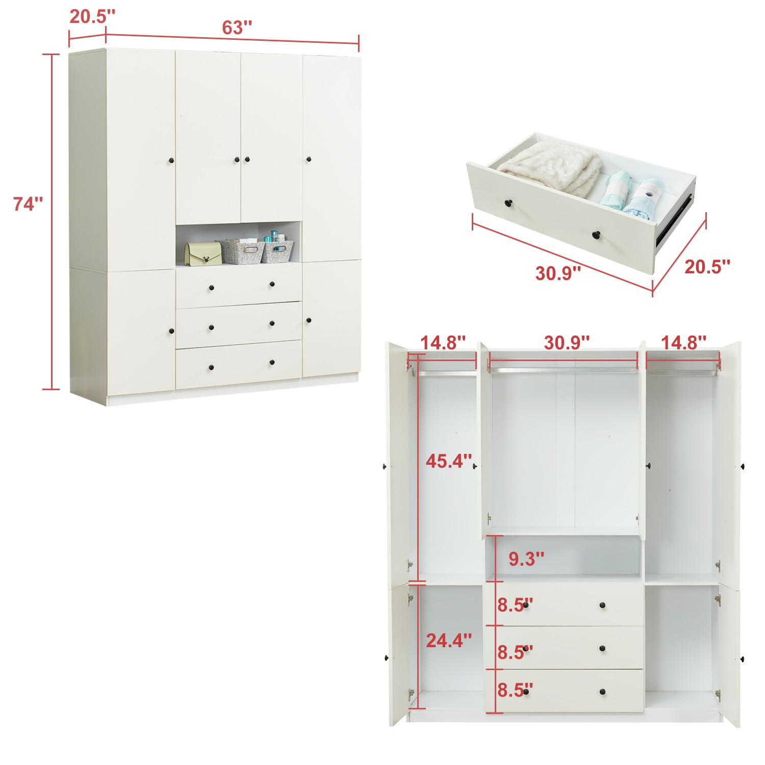 Details: [Creative Storage] - The central hollow space can serve as creative storage, allowing you to place small items, books, or decorative pieces, making it both practical and aesthetically pleasing.This 4-door bedroom wardrobe is meticulously designed to maximize storage space, offering a generous capacity for clothing storage. [Large Storage Capacity] - The armoire rods are constructed from reinforced steel, ensuring they won't break, even when bearing a heavy load. You can confidently hang numerous items without any concerns, so go ahead and make the most of them! Whether your storage requirements involve clothing or bedding, you can easily configure the space to meet your needs. [Strong and Long-lasting] - Constructed with premium engineered particle board, our wardrobe armoire closet is fortified with metal shelf supports and laminated solid wood, guaranteeing exceptional strength and durability for daily use. The metal hinges are built to withstand continuous use over time. Smooth-sliding drawer rails ensure effortless movement, while the protective smooth surface coating guards against scratches, water stains, and fading, ensuring long-lasting durability. [Size and Assembly] - This wardrobe will be shipped in two separate packages for your convenience. The dimensions of the top cabinet armoire wardrobe closet are: 20.5" in depth, 63" in width, and 74" in height. This bedroom wardrobe features four doors and storage shelves, and it requires two-person assembly. It includes step-by-step instructions and all necessary hardware. [Customer Service] - We are here to assist you with installation guidance and support for all of our products. If you have any inquiries or concerns regarding our products, please don't hesitate to contact us. We are committed to providing prompt service support to help resolve any issues you may encounter.