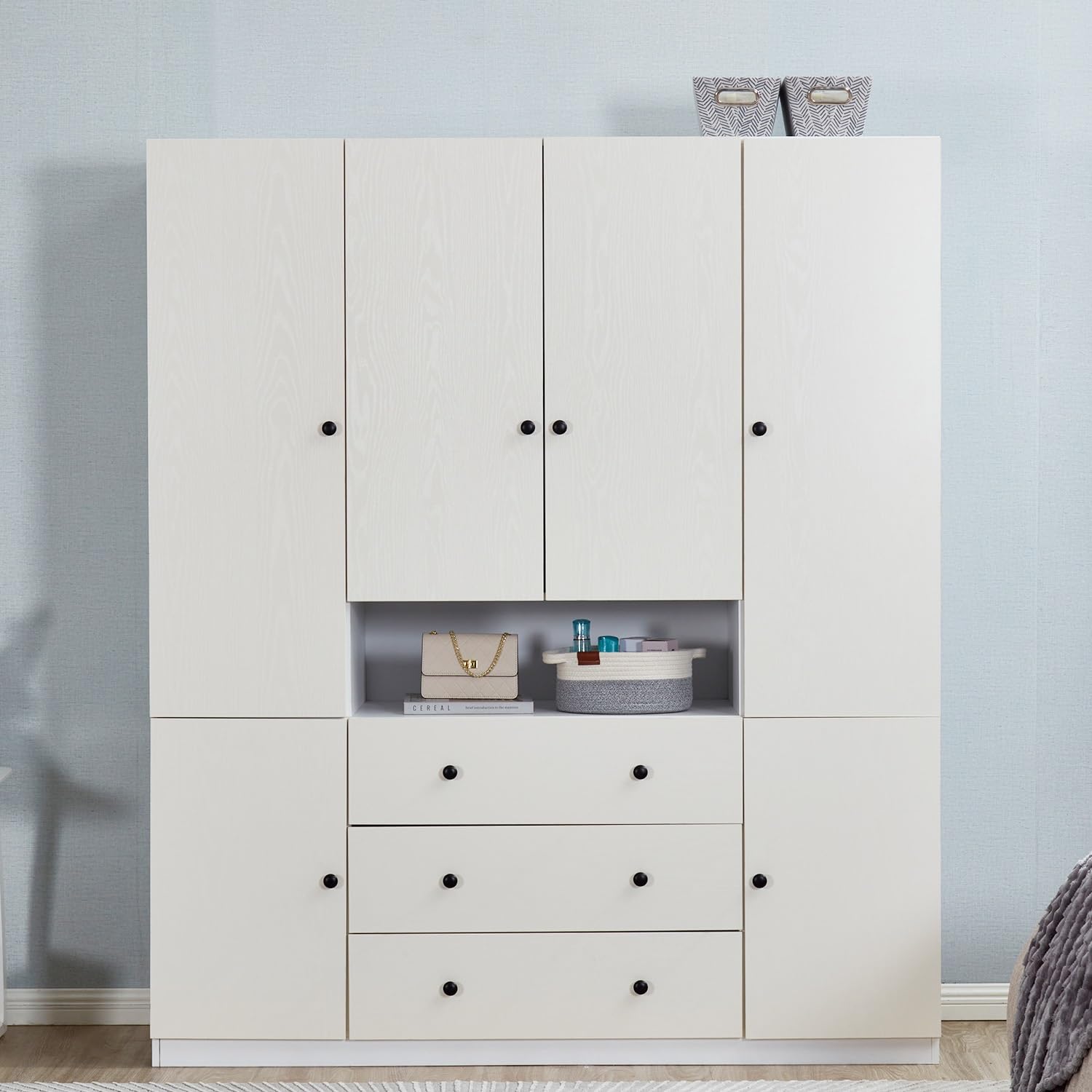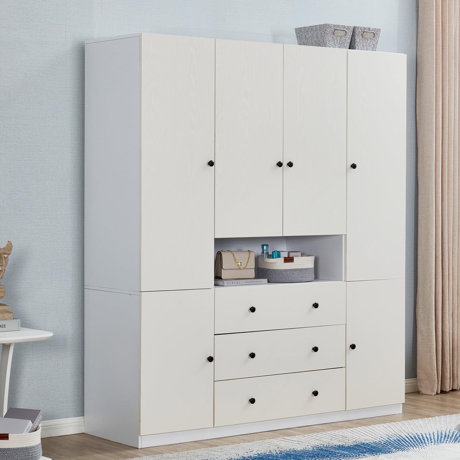 ModMakers 74" Tall 4 Doors 3 Drawers White Wood Wardrobe Closet Armoire Closets for Bedroom Freestanding Bathroom Wardrobe Cabinet with Hanging Rod Shleves Wooden Clothes Storage Organizer
