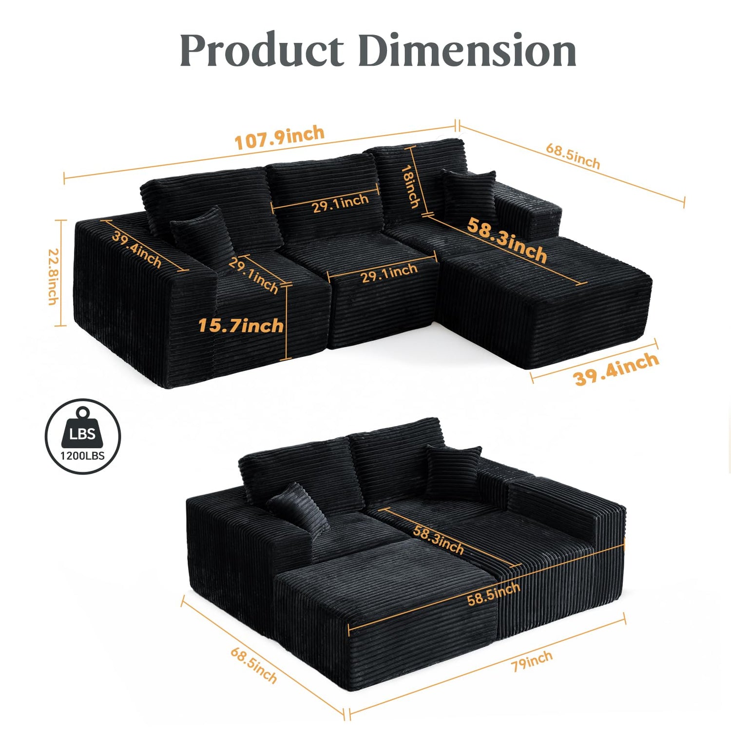 MODNEST 108" Modular Sectional Sofa Cloud Couch with Deep Seats, L Shape Foam Couch with Chaise and Movable Ottoman, Sectional Couches for Living Room, Comfy Boneless Sofa No Assembly, Black