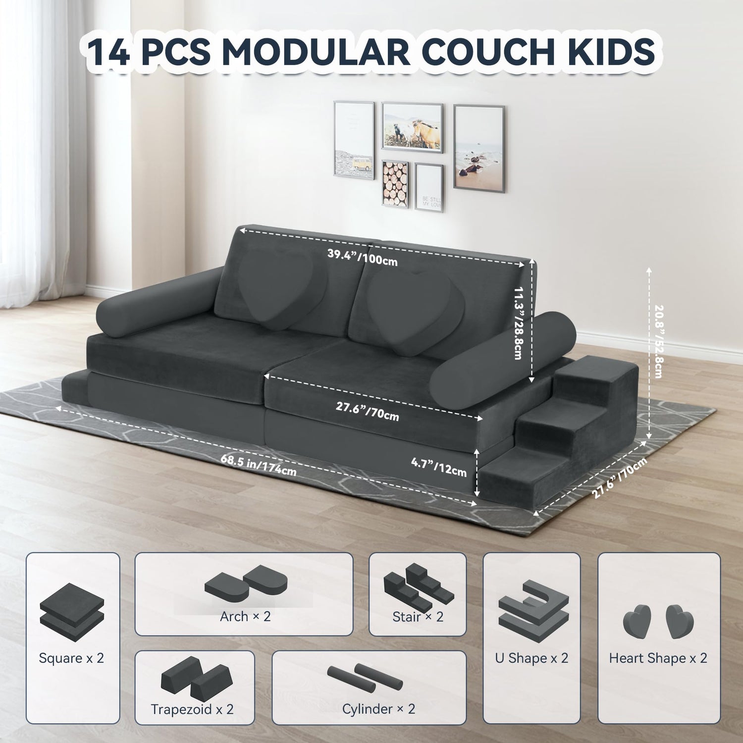 - 14pcs Modular Design: With 14 foam blocks including 2 trapezoids, 2 arches, 2 squares, 2 U-shapes, 2 heart shapes, 2 cylinders, and 2 stairs, this set offers endless building possibilities, encouraging kids to create imaginative structures and scenarios. When set up as a couch, it has a backrest height of 11.8", a width of 68.5", a depth of 20.8", and a seat height of 11.3"