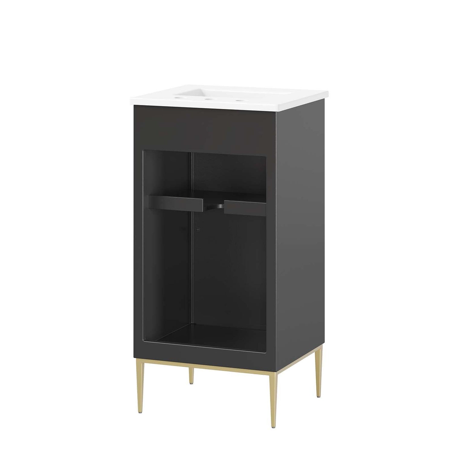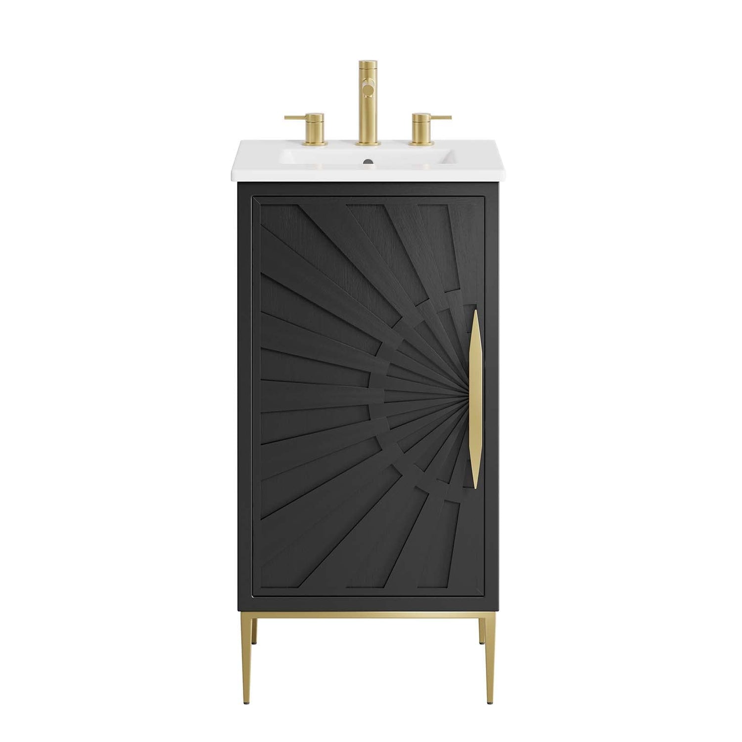 Details: Intricate modernity radiates into your bathroom space with the Awaken 18" Bathroom Vanity. Showcasing clean lines arranged in a radial formation, this bathroom vanity is crafted with solid wood and MDF and rests on a gold base with non-marking foot pads to protect flooring. This vanity is a complete addition to a bathroom with a ceramic sink basin with an integrated countertop and 8" centerset holes. Offering ample storage space for bathroom essentials and more, this vanity cabinet features spacious shelves hidden behind a detailed door with sleek gold hardware. Fixtures not included. Assembly required.