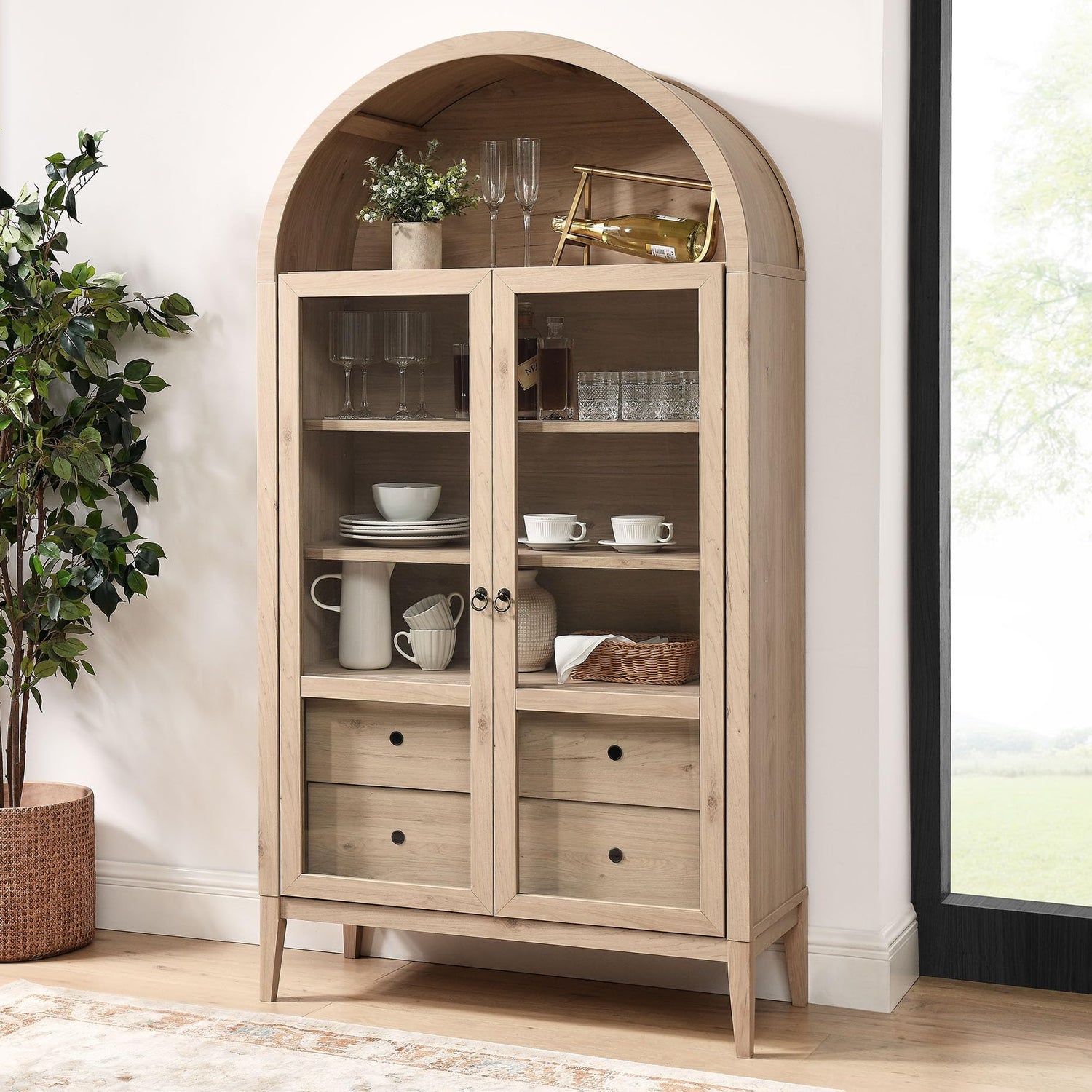 Details: The Nolan Display Cabinet combines functional storage versatility with charming modern farmhouse style. Crafted with a beautiful wood grain laminate, the chic design flaunts subtle edge trimming and an elegantly rounded, arched top shelf. Supported by tapered wood legs, the Nolan tall storage cabinet boasts two doors with tempered glass windows that provide an open view to its interior. Inside the arched cabinet you’ll find two adjustable shelves, a fixed shelf, and two roomy full-glide drawers, offering plenty of storage space for displaying decorative items or for tucking away odds and ends. Complete with soft-close hinges and metal ring pull handles with a brushed gold finish, this wood storage cabinet is as stylish as it is practical. Perfect for your living room, hallway, or dining area, this arched bookcase effortlessly adds an air of sophistication and vintage allure to your home. To protect your flooring, this tall storage cabinet with doors comes equipped with non-marking foot pads. Assembly required. Weight Capacity: Arched Shelf: 88 lbs, Adjustable Shelves: 70 lbs, Fixed Shelf: 62 lbs, Drawers: 22 lbs