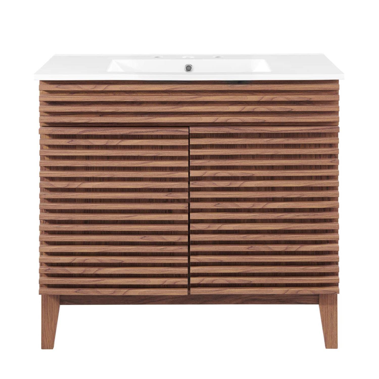 Details: Tap into mid-century aesthetics with the Render Vanity. The Render 36" Bathroom Vanity features a durable MDF and particleboard frame with smooth walnut grain laminate, four tapered wood legs, and ample storage space behind two soft-close hinged doors. Crafted with ceramic, a single sink with an integrated countertop, 8" centerset, and rectangular sink basin continue the sleek look of this retro modern vanity. Clean lines and crisp design align for an edgy style designed to meet your needs. Boasting a mid-century modern style this vanity features a solid construction with a pleasing look and practical functionality. Assembly required and fixtures not included.