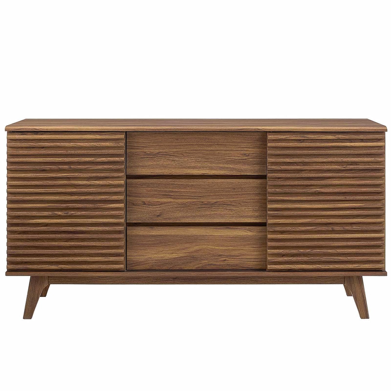 Details: Tap into mid-century aesthetics With the render sideboard buffet display stand. This dining room buffet table features a durable particleboard frame with smooth Walnut grain laminate, four tapered wood legs, an adjustable shelf on both sides, three center full-extension glide drawers, and two sliding doors for easy access to shelf storage. Render features an abundance of storage for your silverware, dishes, and other dining room finery. Boasting a mid-century modern style this accent table features a solid construction with a pleasing look and practical functionality. Perfect as a sideboard, credenza, storing and serving buffet table, and display stand, transmit also accommodates flat-screen TVs up to 70” wide as a living room or lounge area TV stand.