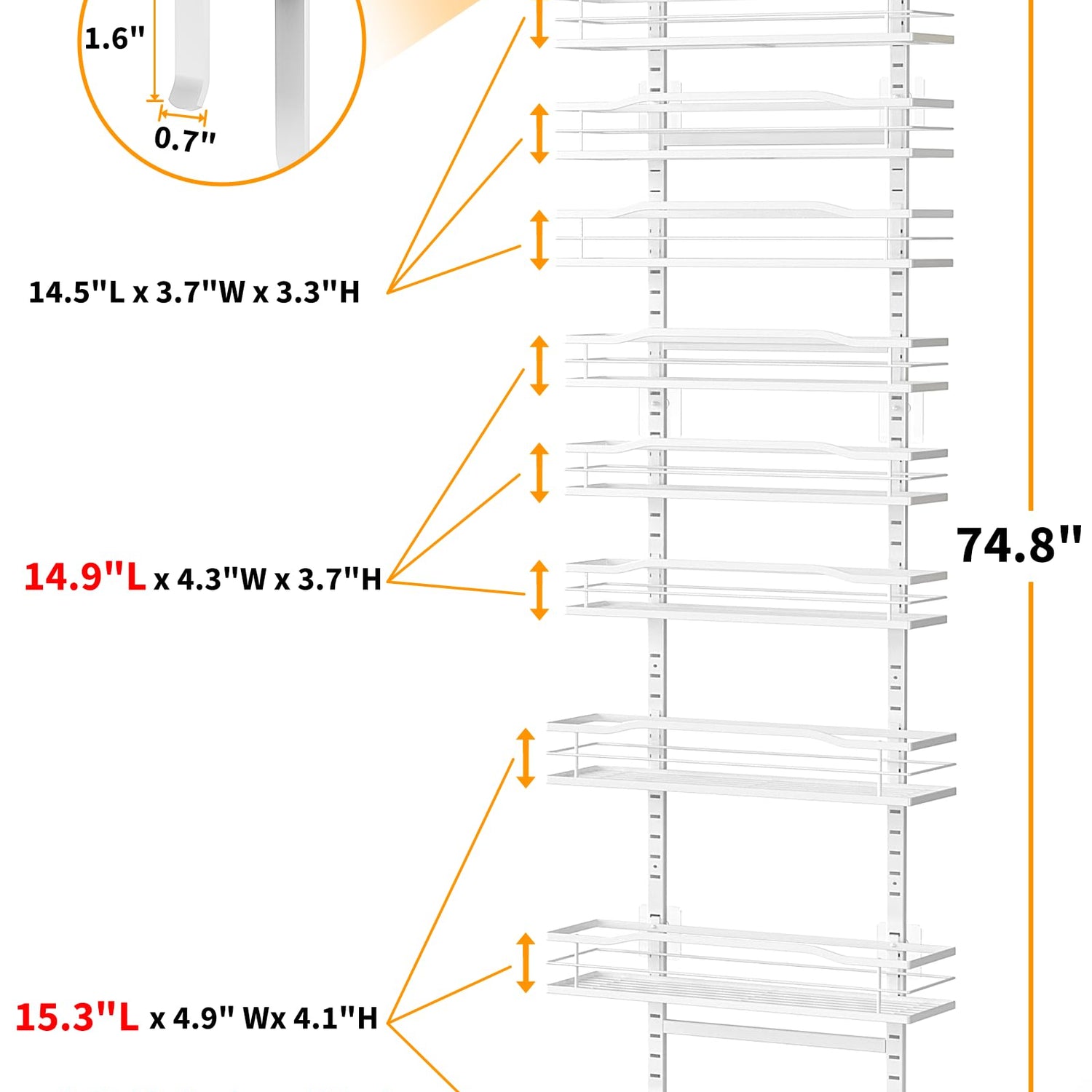 - You will get 3 large shelves (15.3"L x 4.9" x 4.1"H), 3 medium shelves (14.9"L x 4.3" x 3.7"H), 3 small shelves (14.5"L x 3.7"W x 3.3"H), including all necessary mounting hardware. The overall height after installation is 6.2ft, suitable for most doors. USPTO Patent Number:29884987. PLEASE NOTE: You may receive the wrong package showing "8-Tier", but the item inside is completely correct 9-tier.