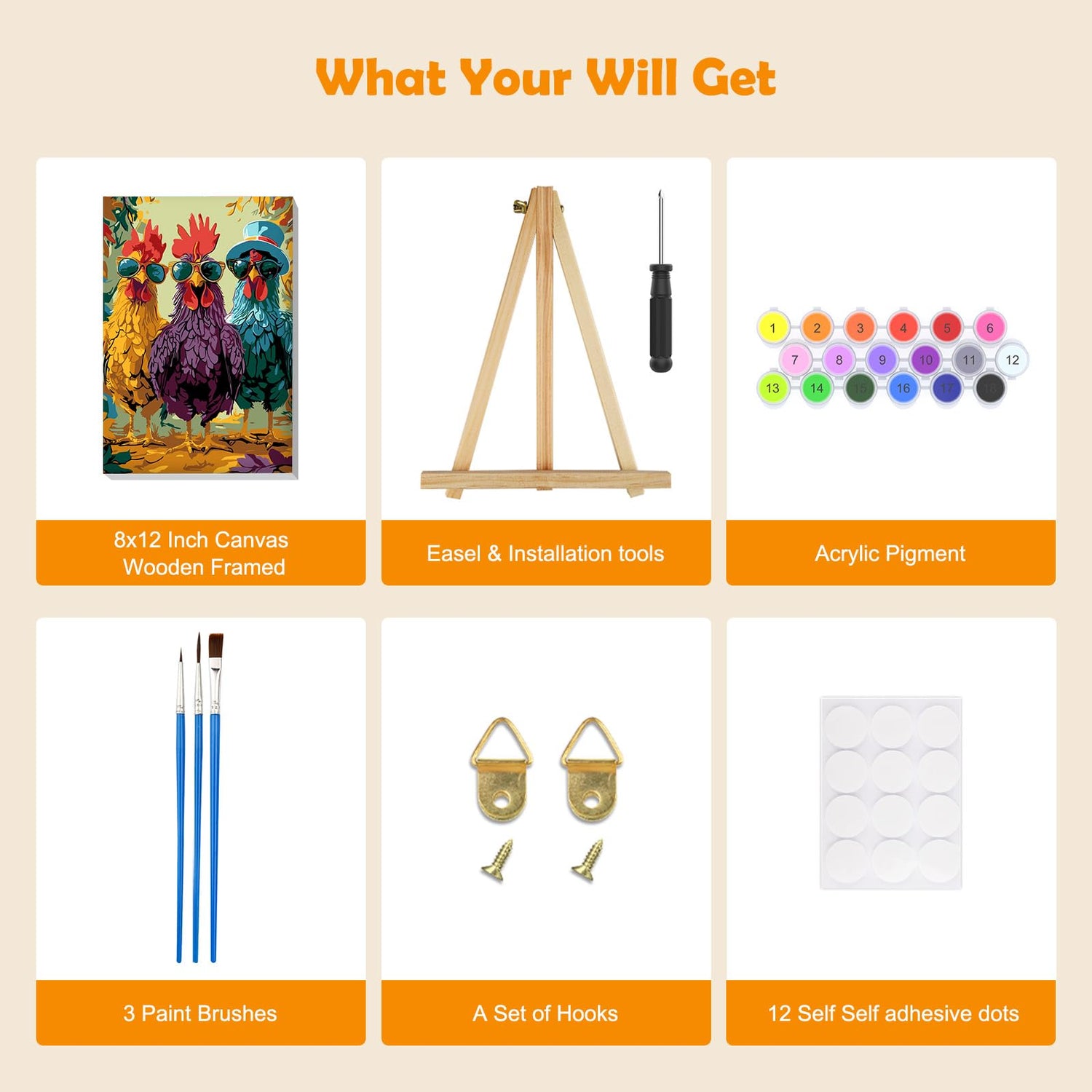 - What You Will Get: Each paint by number kit includes a wooden frame canvas, a wooden easel, three different size of paintbrushes, a set of colorful acrylic pigments, a set of nail hooks, a reference picture and eight self adhesive dots