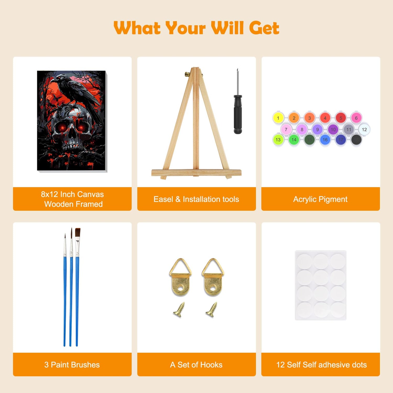 MOGTAA Halloween Paint by Numbers Kit for Adults Beginners with Frame, Skull Adult Paint by Number Kits on Canvas with Easel, Easy DIY Birds Oil Painting Kits for Home Decor, 8x12in