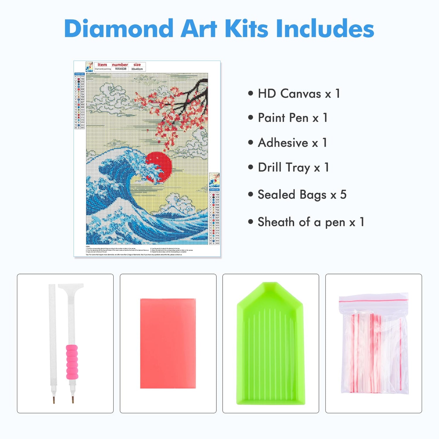 - What You Will Get: Diamond art kits includes a high definition painting canvas, a red glue clay, a cube diamond tray, enough colorful round diamonds. In addition, we offer an extra 30% drilling for each color