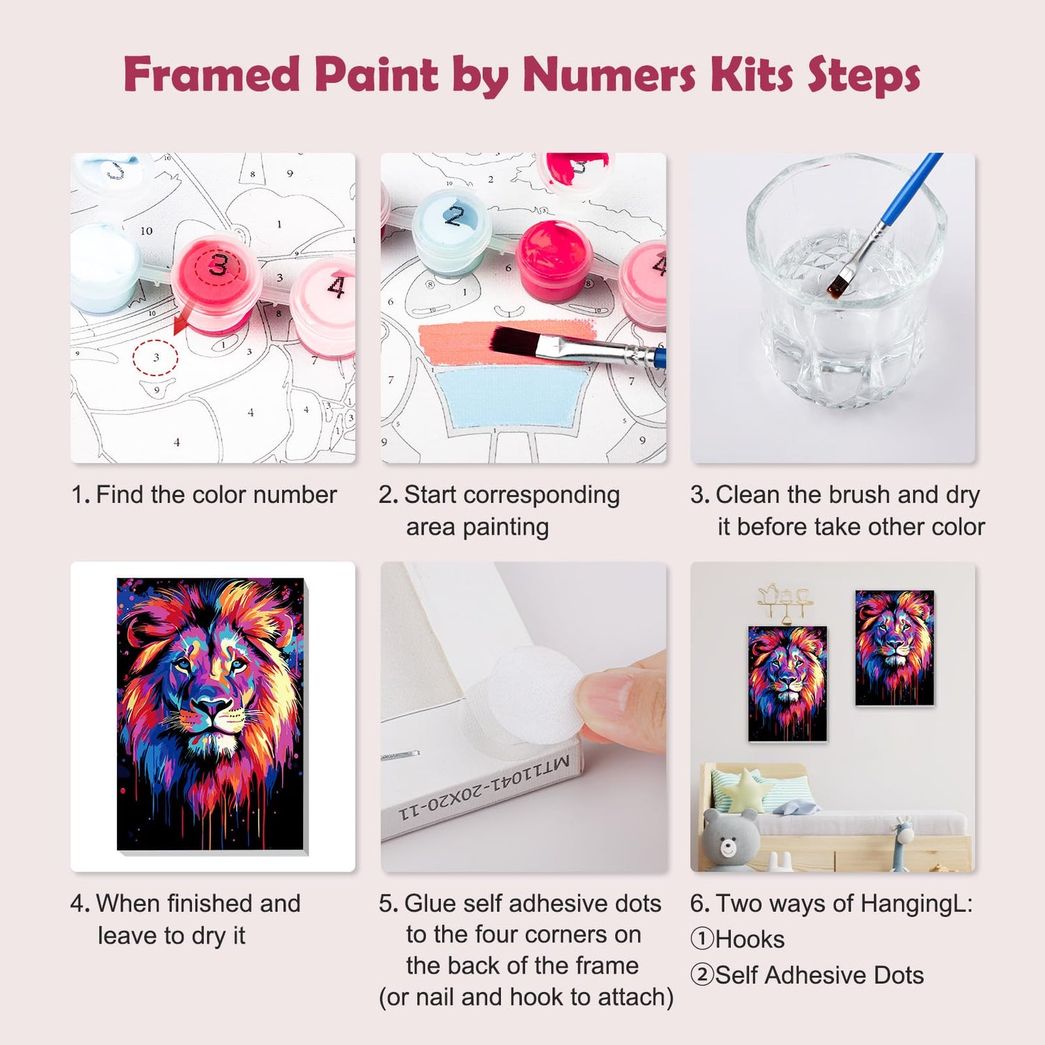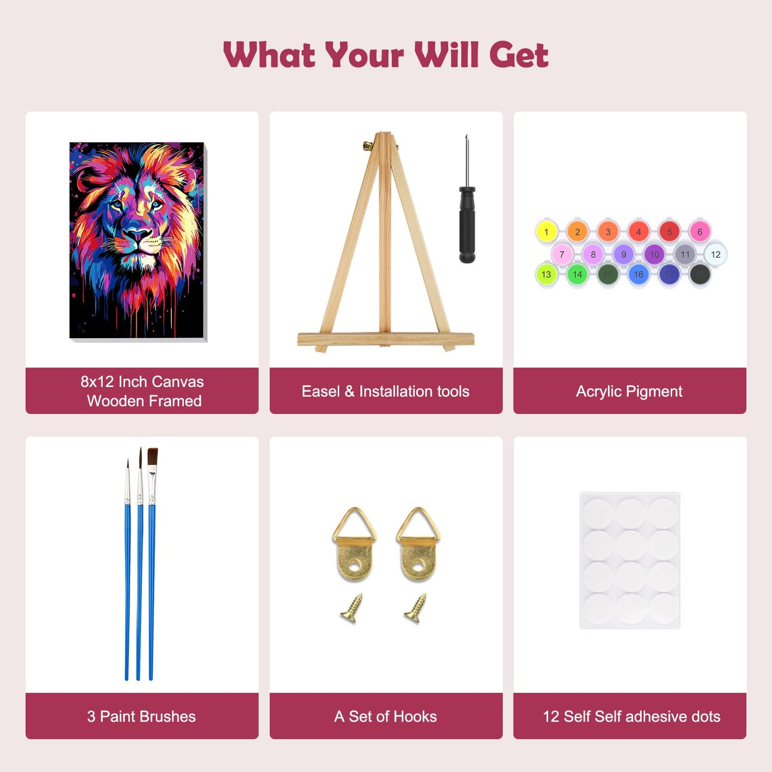 - What You Will Get: Each paint by number kit includes a wooden frame canvas, a wooden easel, three different size of paintbrushes, a set of colorful acrylic pigments, a set of nail hooks, a reference picture and eight self adhesive dots