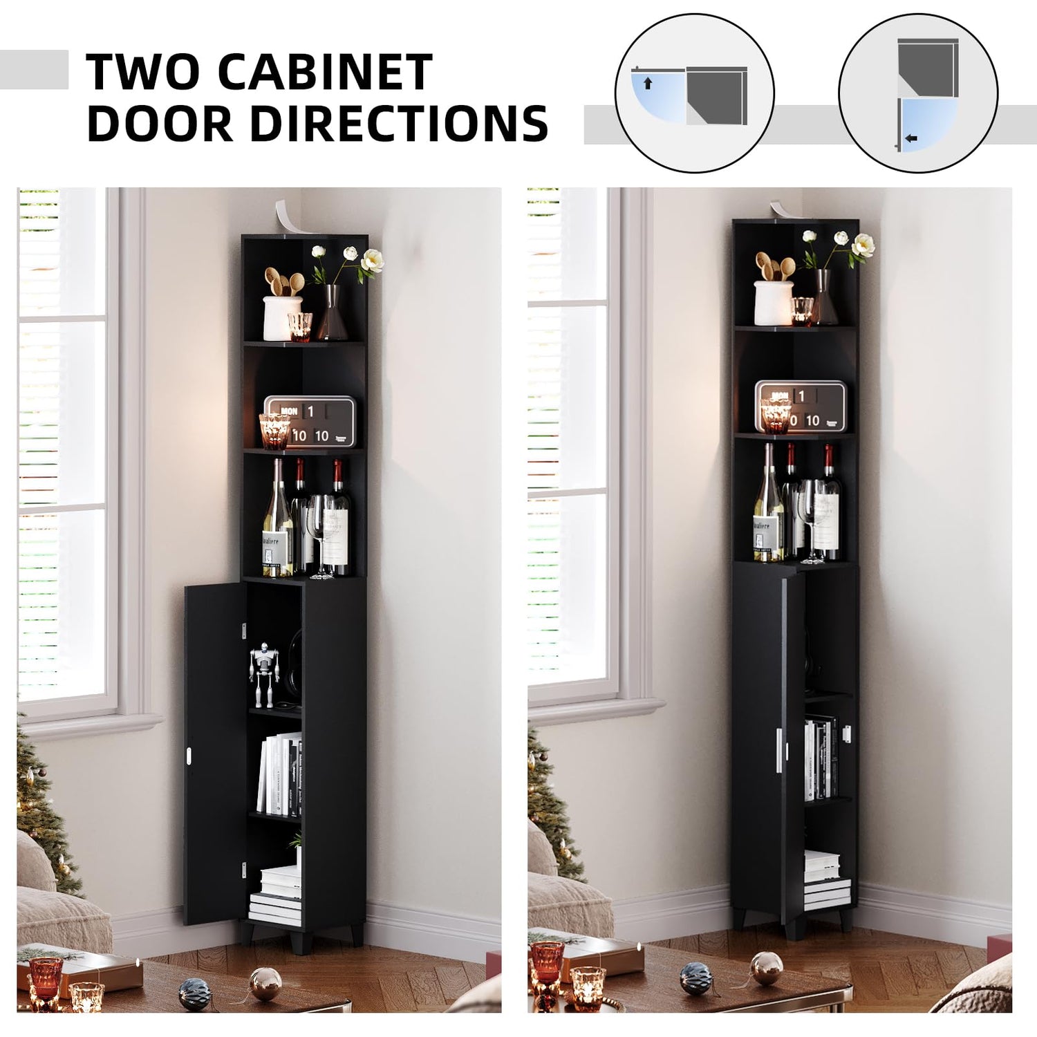 MOHOPE Corner Shelf with Cabinet, 74.8" Tall Corner Cabinet with Door, 5-Tier Narrow Bookshelf with Adjustable Shelves, Display Cabinet for Living Room, Bathroom, Dining Room, Small Space, Black