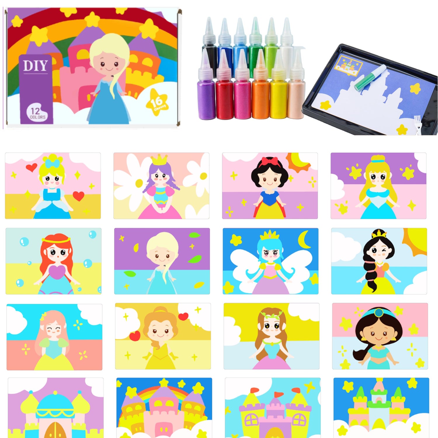 MoimTech Sand Art Kits for Kids,16 Arts and Crafts Designs,Sheet Sand Art Painting Cards,Princess and Castle Theme,Reusable Sand Tray 12 Color Sands & Tools,Stocking Stuffers for Kids