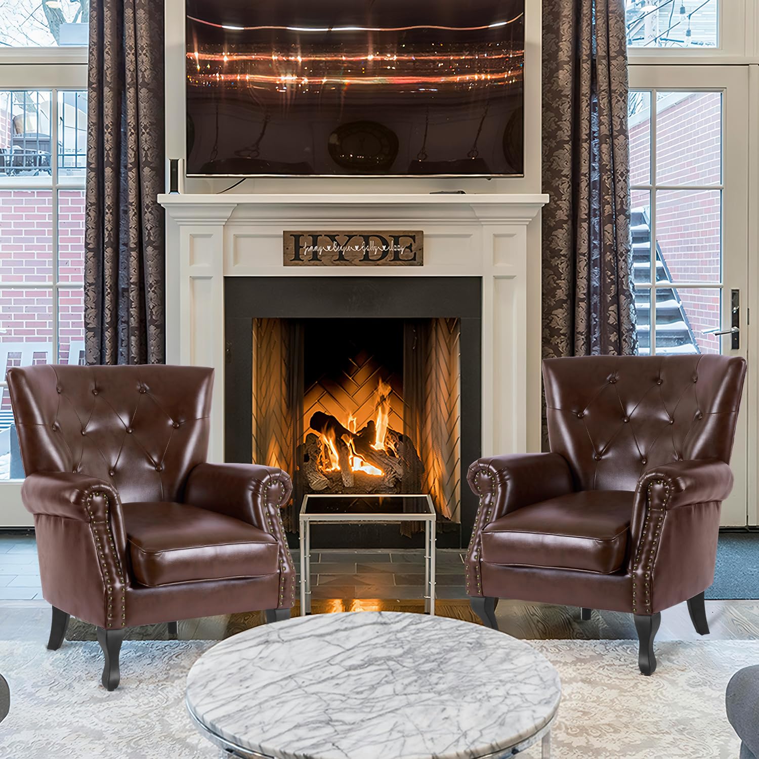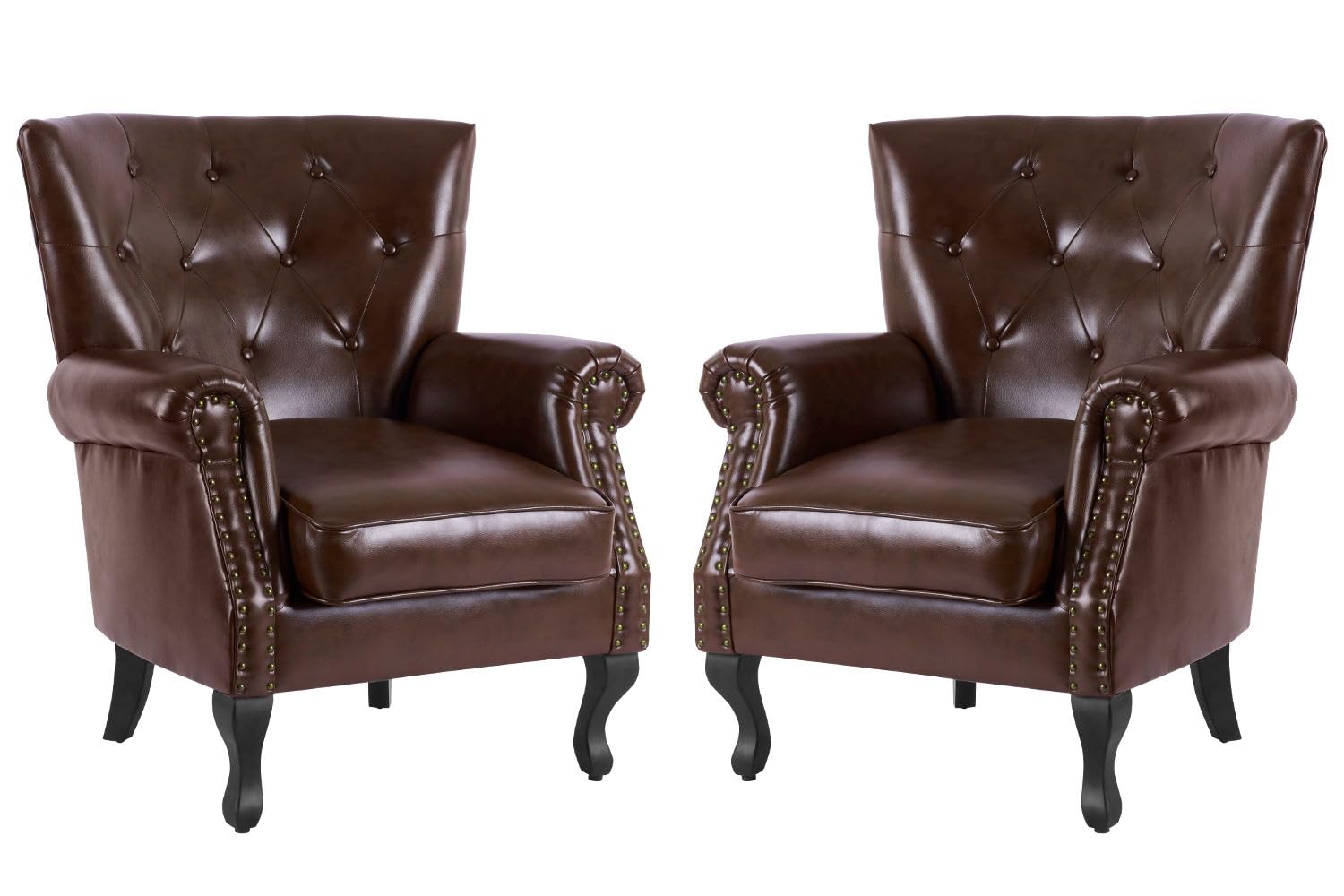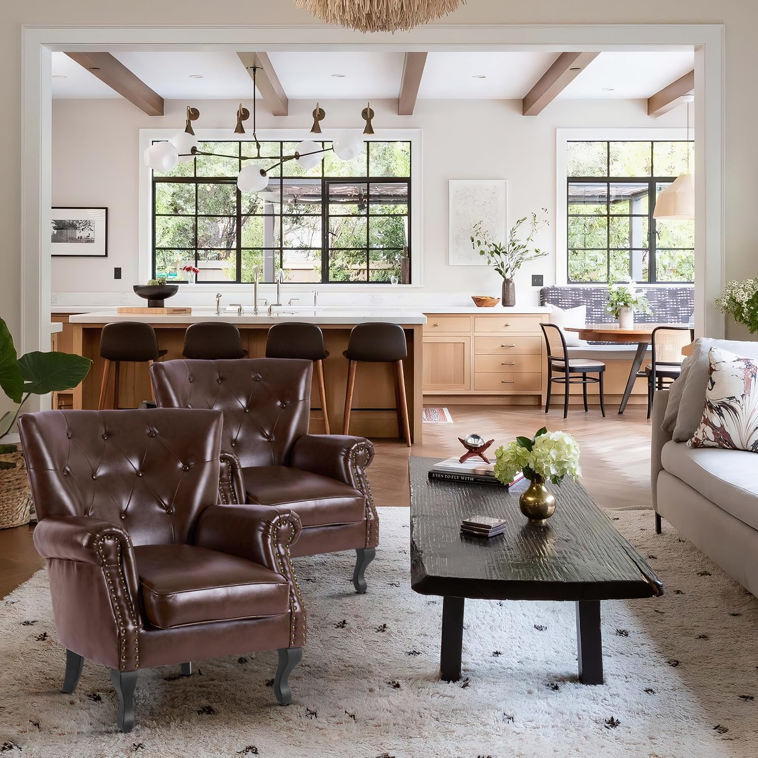 MOJAY PU Leather Accent Chair Set of 2, Mid-Century Modern Armchair Living Room Club Chair with Tufted Button & Rivet Trim, Upholstered Sofa Chair with Sturdy Wood Legs for Bedroom (Reddish Brown)