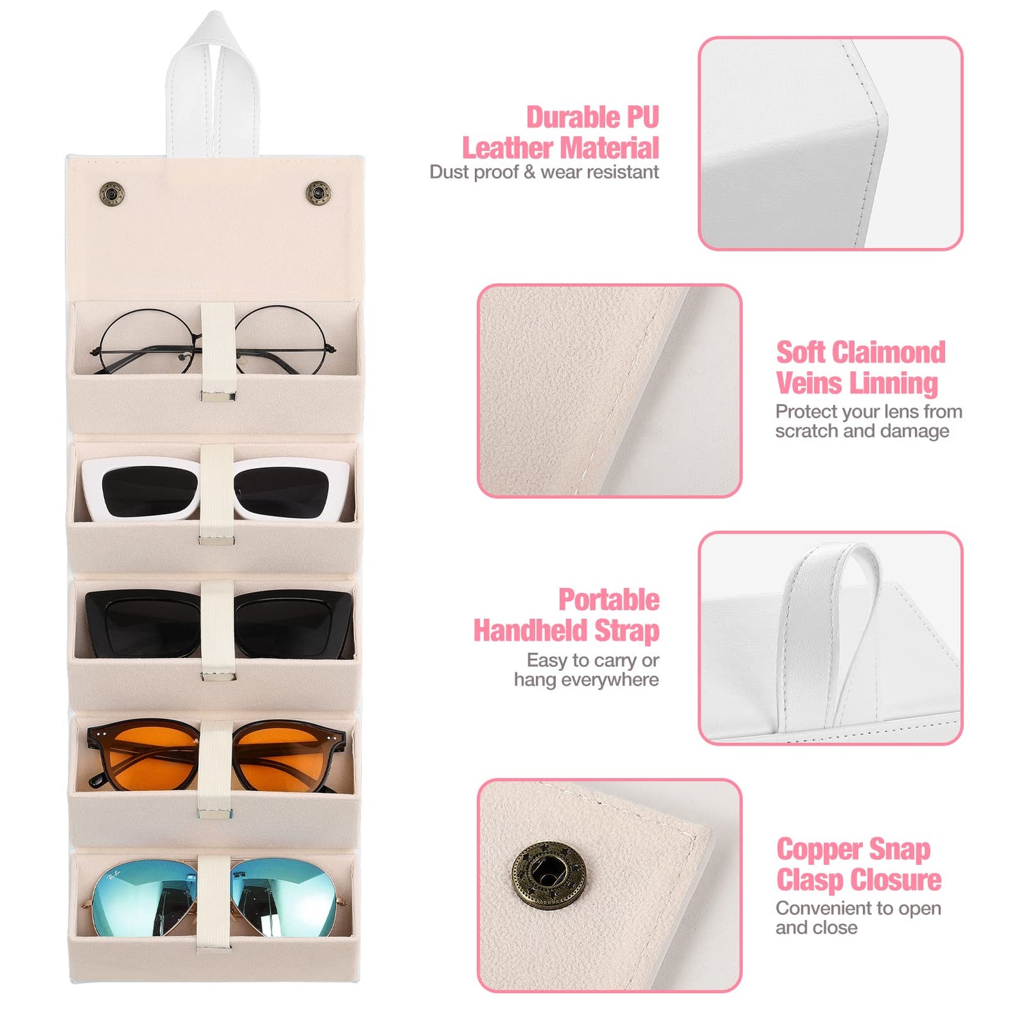 MoKo Sunglasses Organizer with 5 Slots, Foldable Travel Glasses Storage Case Holder Eyewear Display Box, White