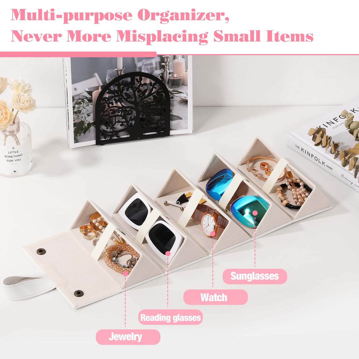 - Wide Use Case: You can not only store your sunglasses, but earrings, watches, keys, necklaces, cosmetics, and other small items. Unfold Dimensions: 18.5*6.5 inches, Fold Dimension: 6.5*4.7*5 inches.