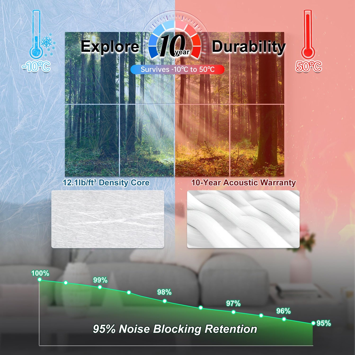 - ELITE ACOUSTIC ENGINEERING: 6D polyester matrix with NRC 0.95 rating absorbs 95% echoes and 60% mid-high frequency noises (800-4000Hz); Independent lab tests show 18dB reduction in home theaters and 34% speech clarity improvement in conference rooms