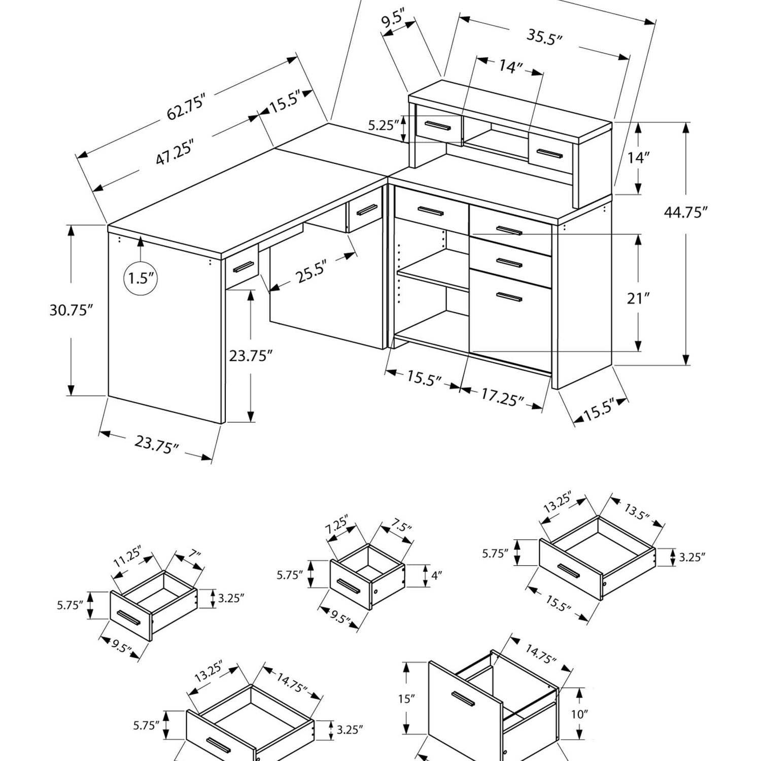 Details: This L-shaped computer desk features a spacious worksurface and a storage unit with hutch that can be installed on the left or right. It offers ample space for a small printer and includes a drawer for hanging letter- or legal-size files. Additional dimensions: Main desktop: 62.75 inches L x 23.75 inches W 2 small storage drawer interiors: 7 inches L x 11.25 inches W x 3.25 inches H each Hutch dimensions: 35.5 inches L x 9.5 inches W x 14 inches H 2 hutch drawer interiors: 7.5 inches L x 7.25 inches W x 4 inches H each Hutch shelf: 14 inches L x 9.5 inches W x 5.25 inches H Storage unit left drawer interior: 13.5 inches L x 13.25 inches W x 3.25 inches H Storage unit upper shelf: 15.5 inches L x 13.75 inches W x 10 inches H* Storage unit lower shelf: 15.5 inches L x 13.75 inches W x 10 inches H* Storage unit upper and middle drawer interiors: 14.75 inches L x 13.25 inches W x 3.25 inches H each Storage unit bottom drawer interior: 14.75 inches L x 13.25 inches W x 10 inches H *Heights vary according to placement of adjustable shelf