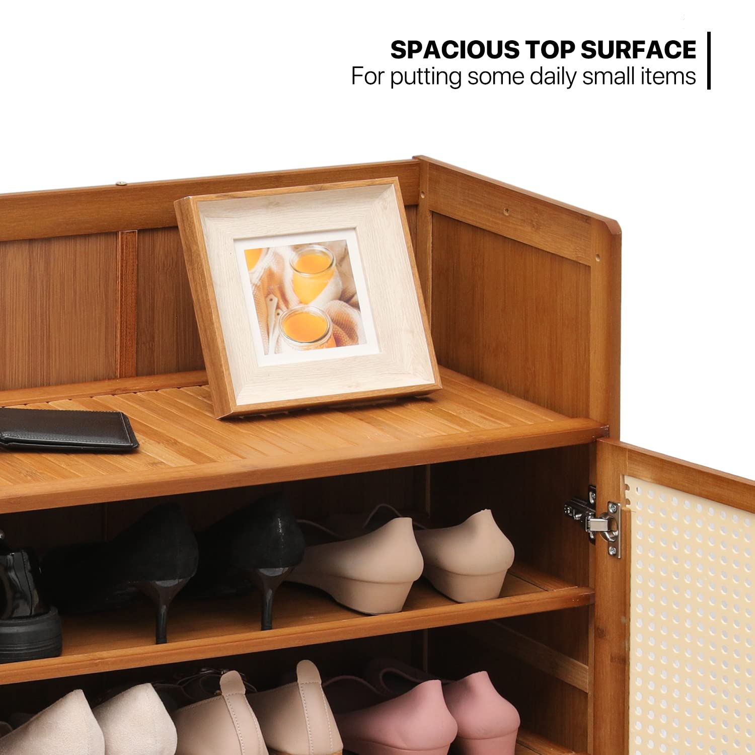 - Premium Materials - This shoe cabinet is made of high-quality bamboo, strong and durable. The door is made of ABS rattan style with mesh air hole design, beautiful and breathable, suitable for all kinds of home storage.