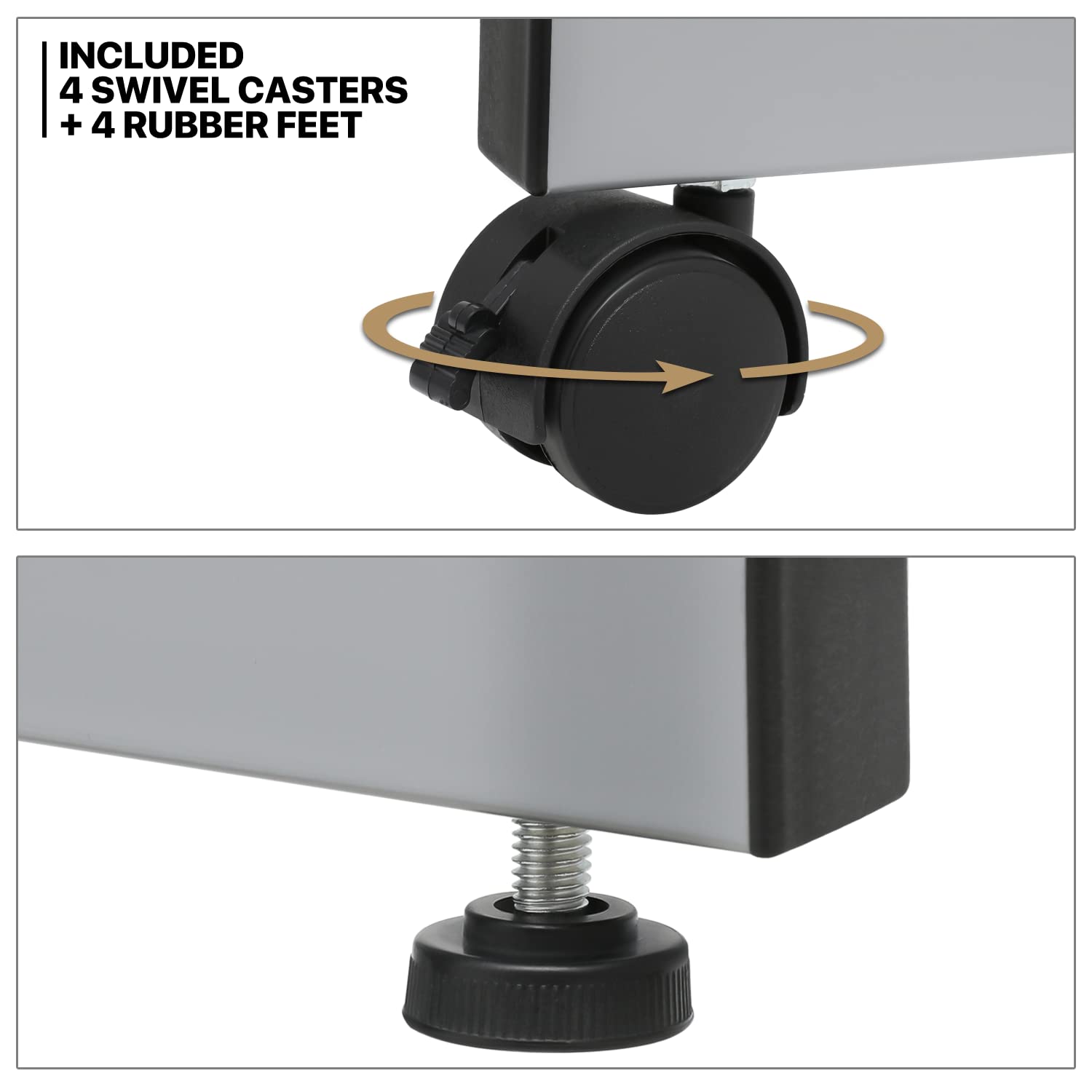- 4 Swivel Casters + 4 Rubber Feet - This portable drafting table comes with 4 360° swivel casters for flexible mobility, 2 with brakes for easy locking of the table in position. The other 4 rubber feet will prevent it from destroying the floor, especially on wooden floors.