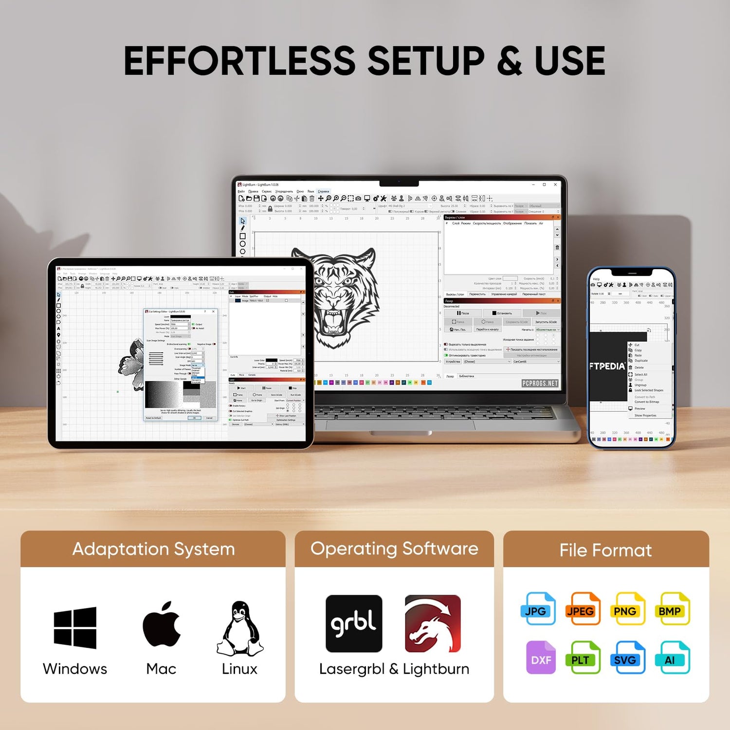 • Smart Control via Phone and PC:The portable laser engraver is compatible with Windows, macOS, and Linux. Supported software includes LaserGRBL and LightBurn. Supports various file formats such as JPG, BMP, PNG, DXF, SVG, AI, and TIFF.