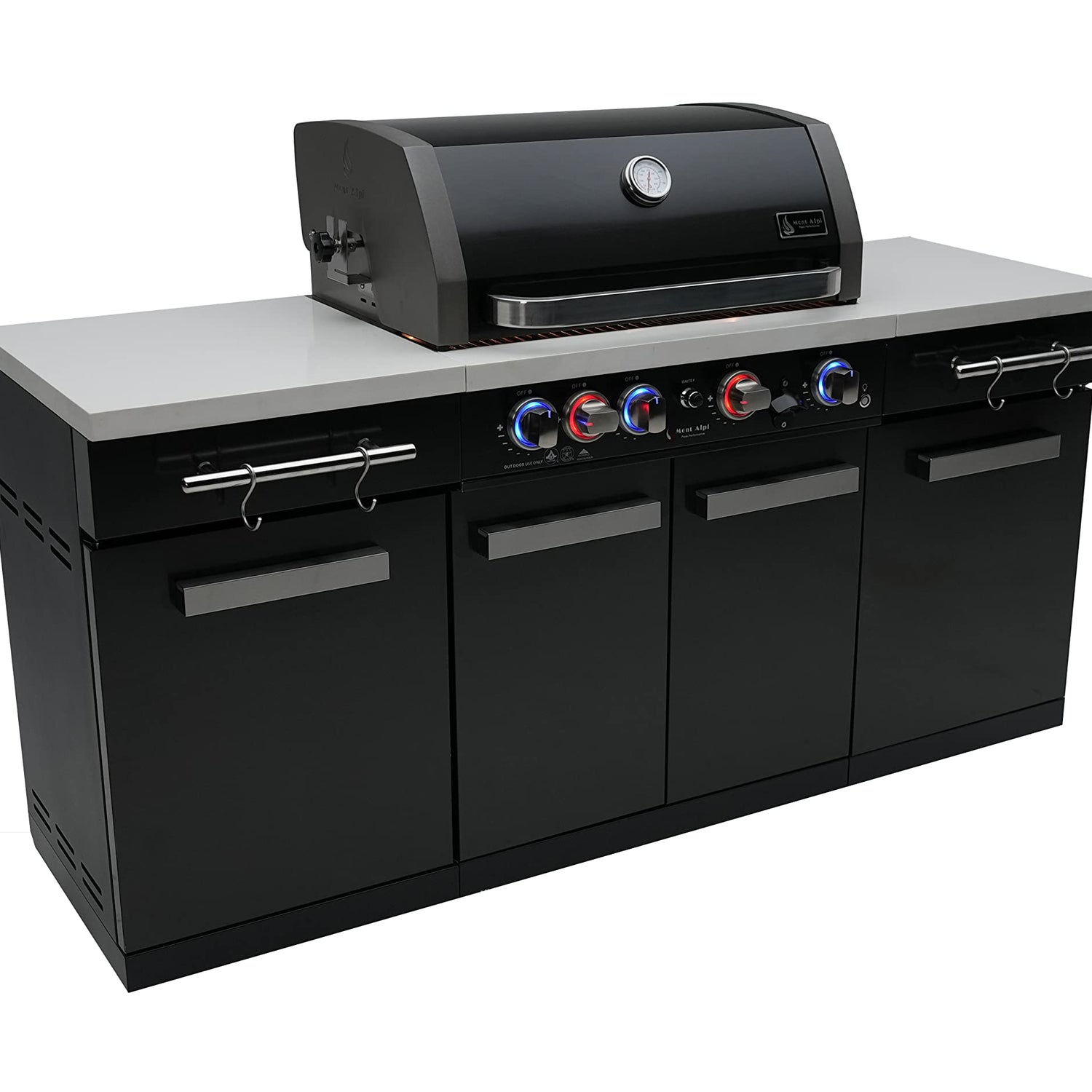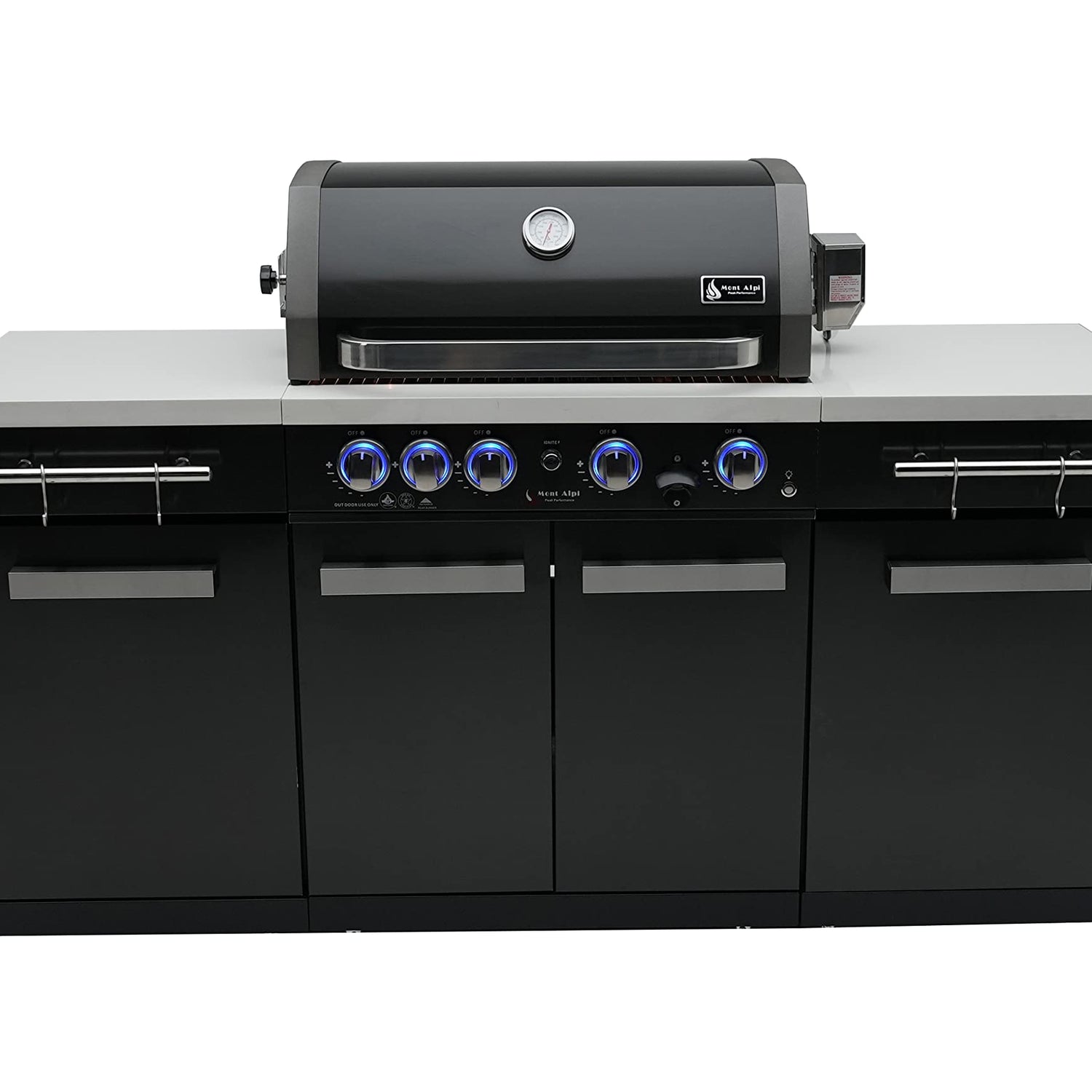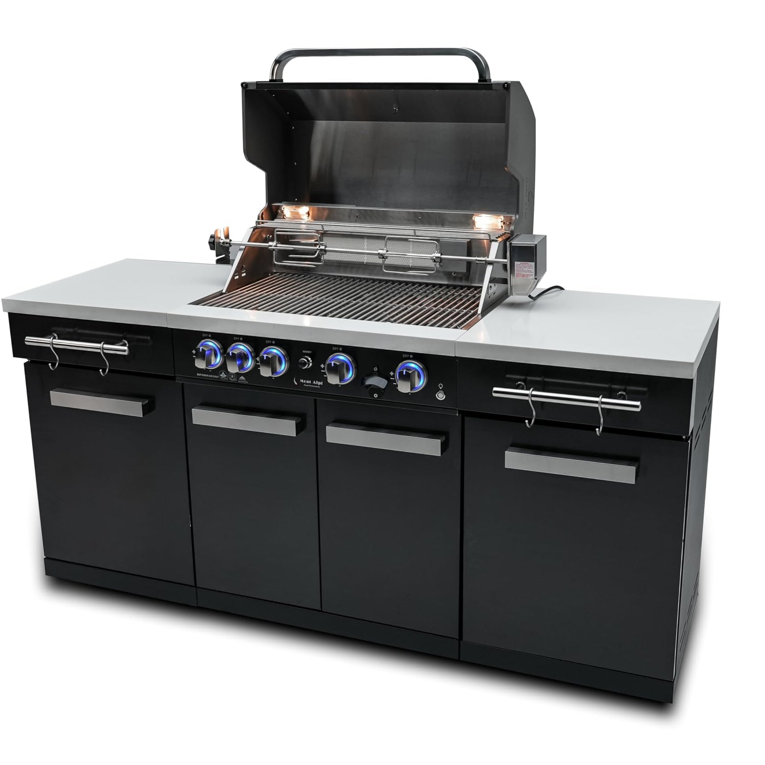 Mont Alpi MA-957 32-inch 5 Burner 63000 BTU Black Stainless Steel Compact Outdoor Kitchen Island Barbecue Grill with Grill Cover & Rotisserie Kit + Storage Cabinets and White Granite Countertops