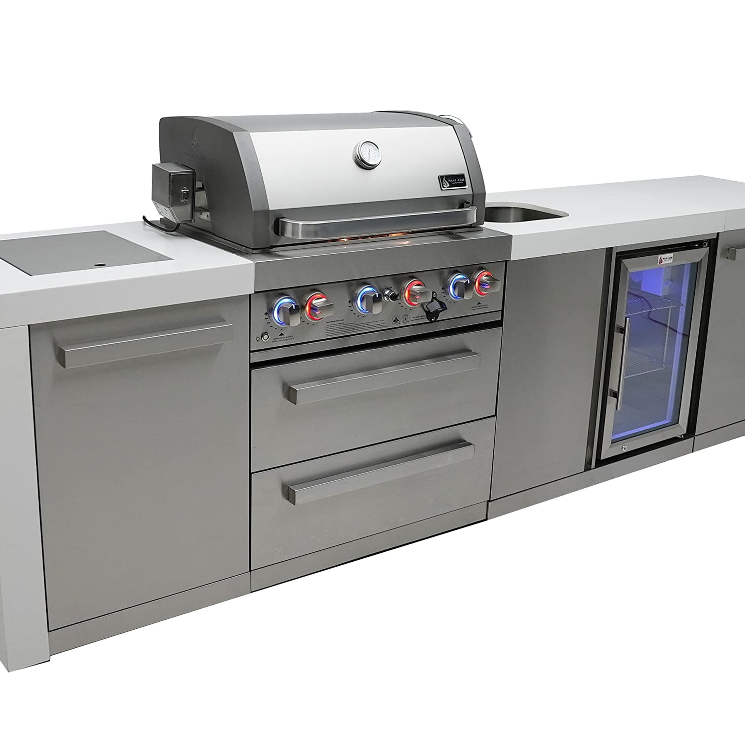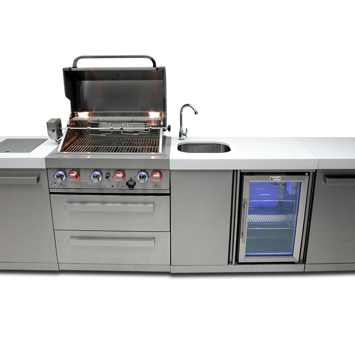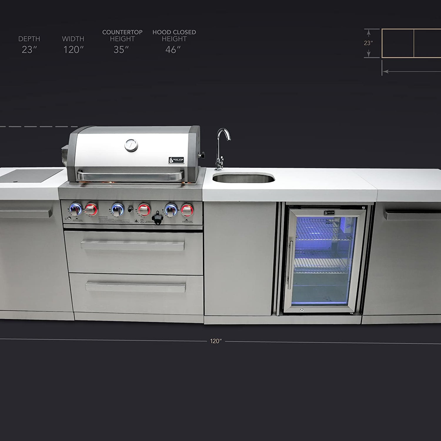 - BEVERAGE CENTER FEATURES - The Mont Alpi beverage center comes the outdoor rated MAF refrigerator standard. This modular attachment also comes with the convenience of a built in faucet and sink making it a sleek and stylish addition to your outdoor kitchen. The beverage center also comes with matching white granite countertop surfaces. Dimensions - 38” x 23” x 35”
