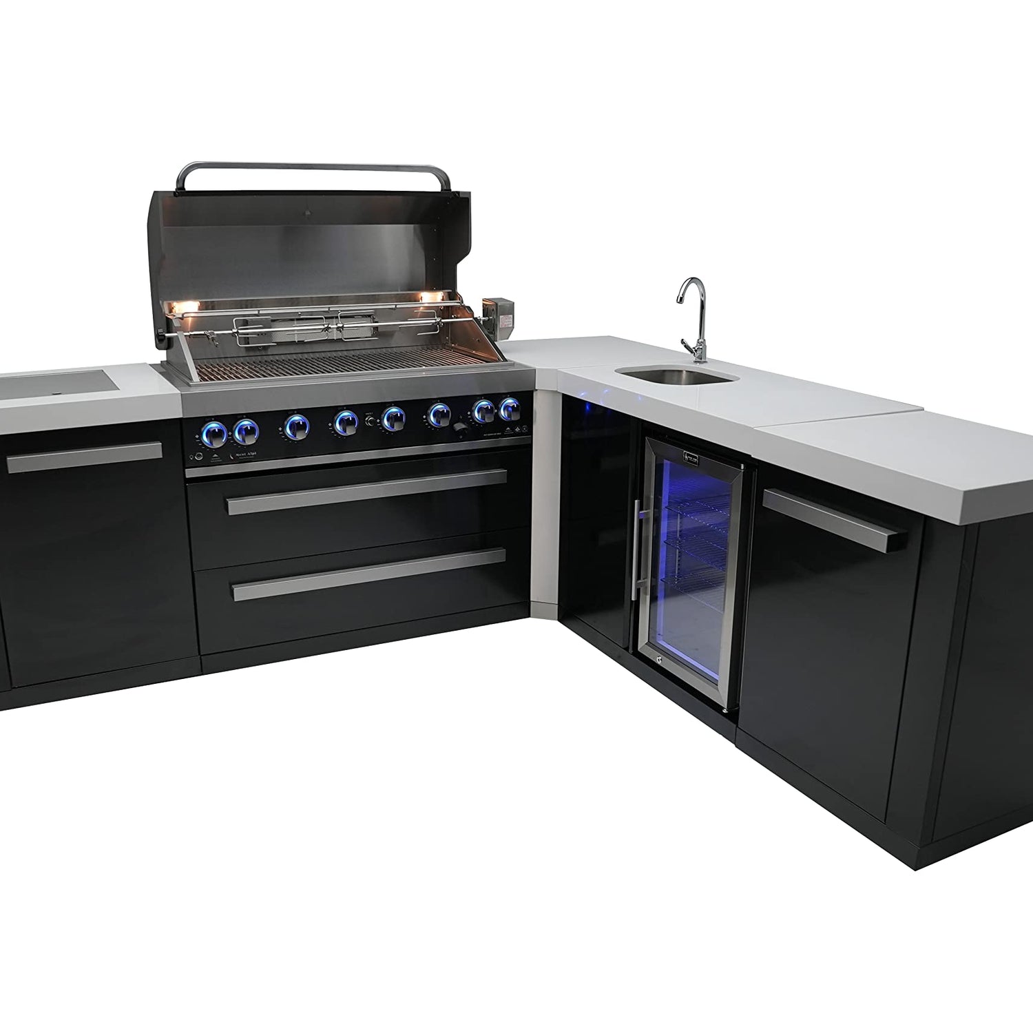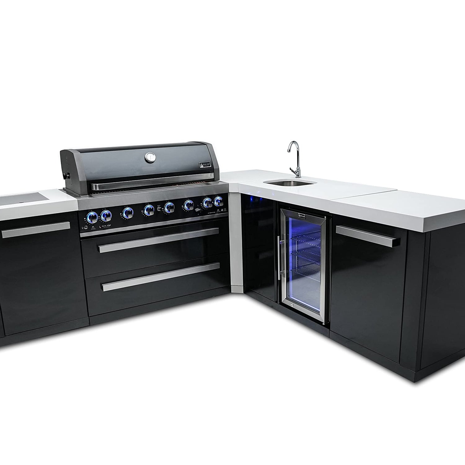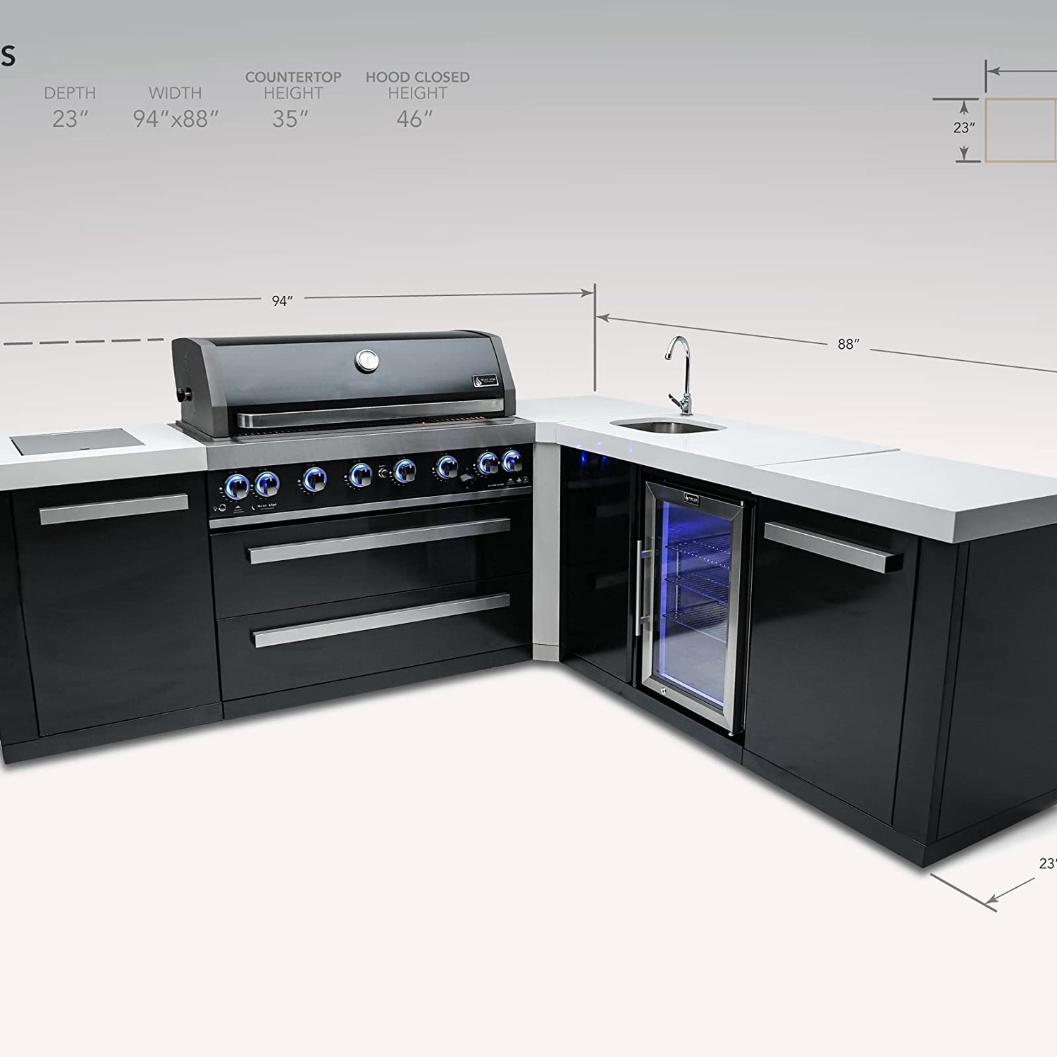 Mont Alpi MAi805-BSS90BEV 44-inch 6-Burner 115000 BTU 90 Degree Corner Black Stainless Steel Gas Outdoor Kitchen Bar Barbecue Island Grill w/Wine Cooler Beverage Center Refrigerator